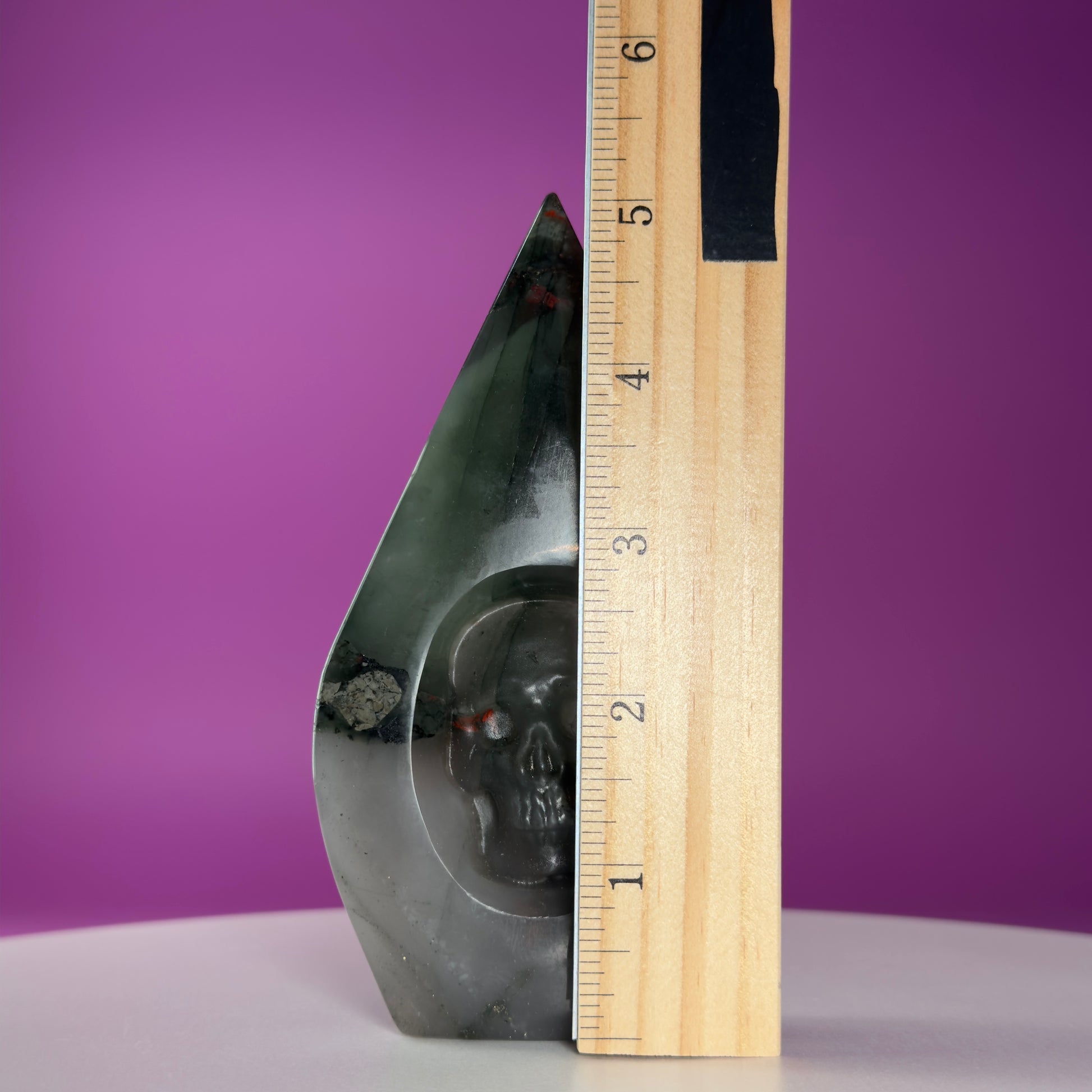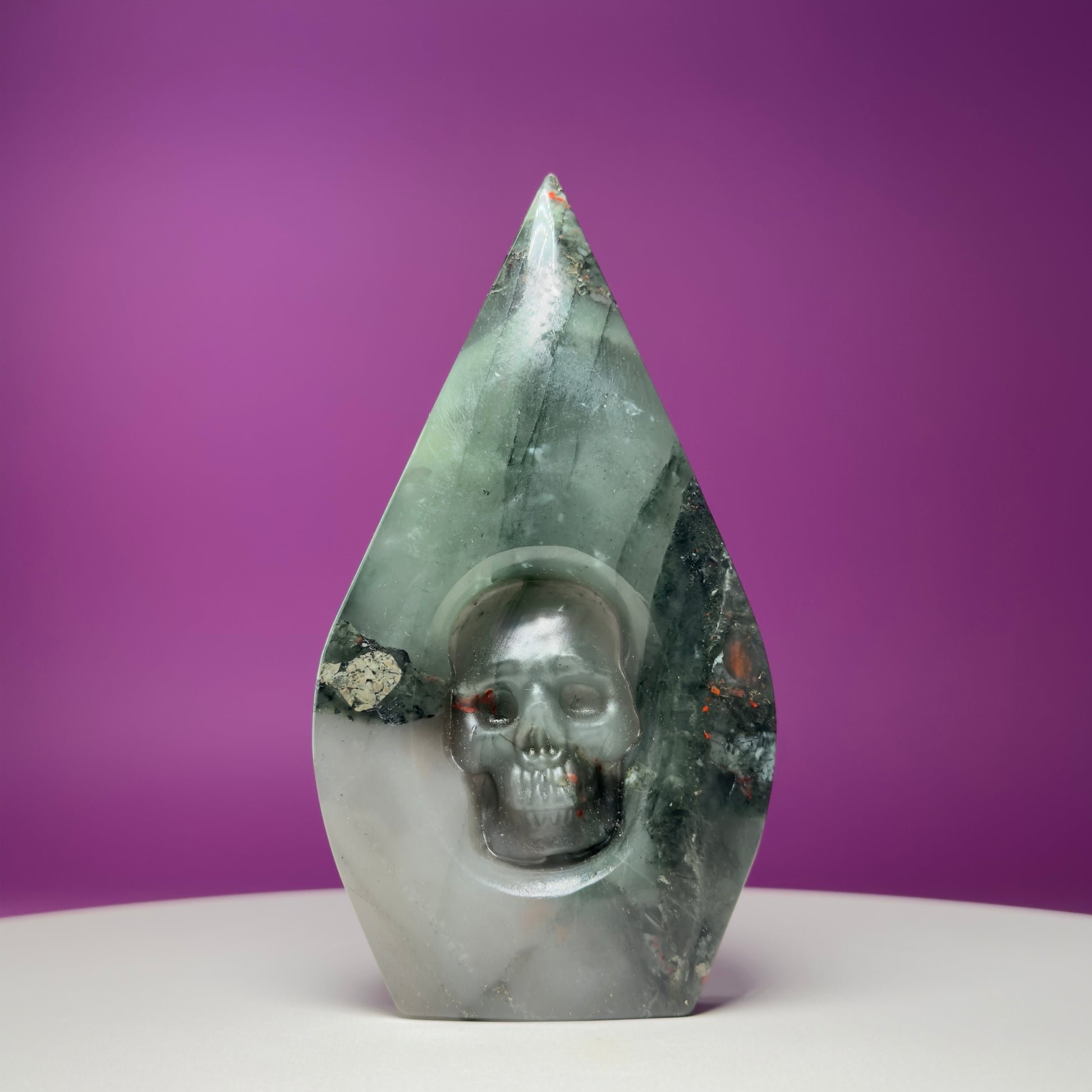 This striking African Bloodstone Skull Flame combines the ancient symbolism of the skull with the rising energy of a flame form, creating a powerful piece that feels both protective and transformative.