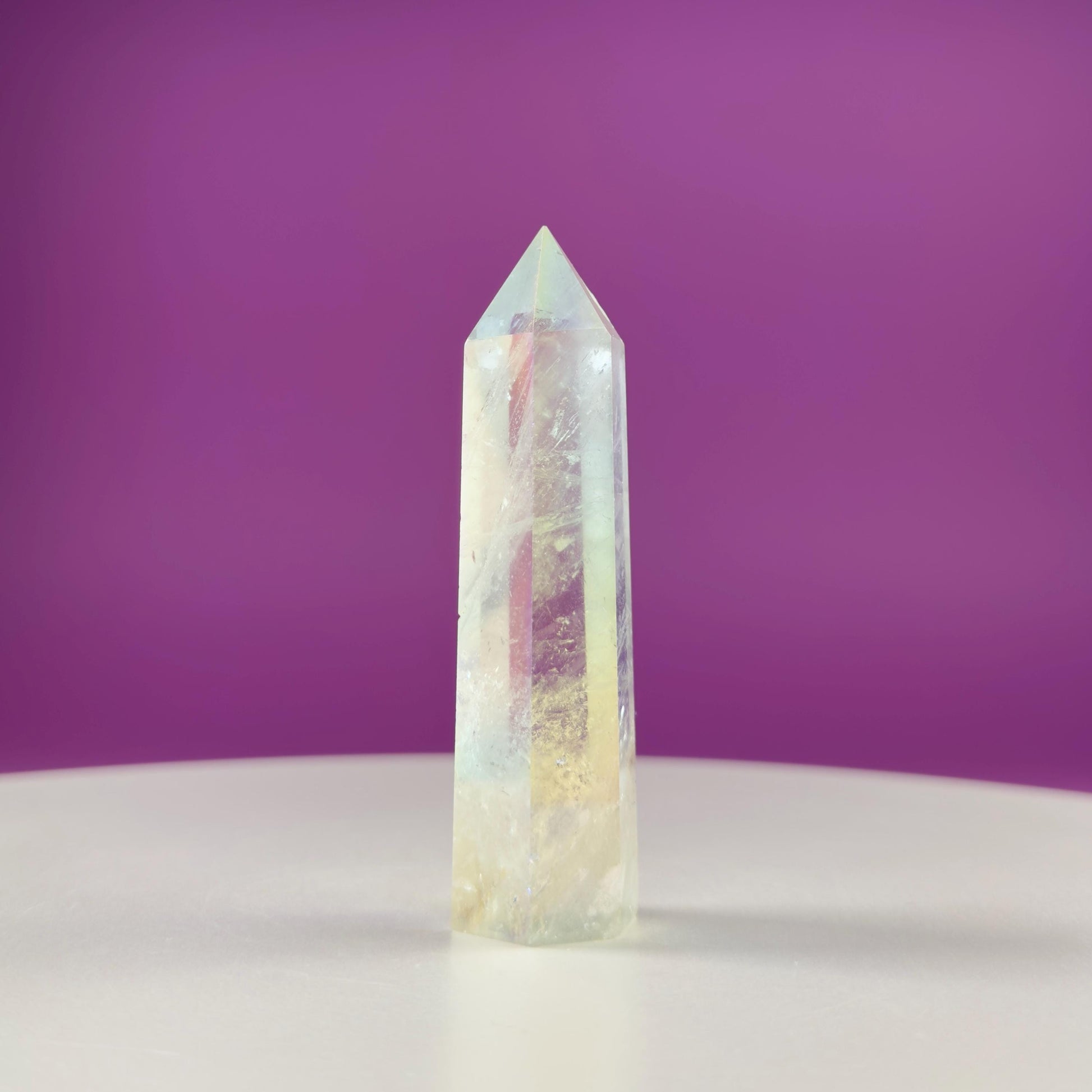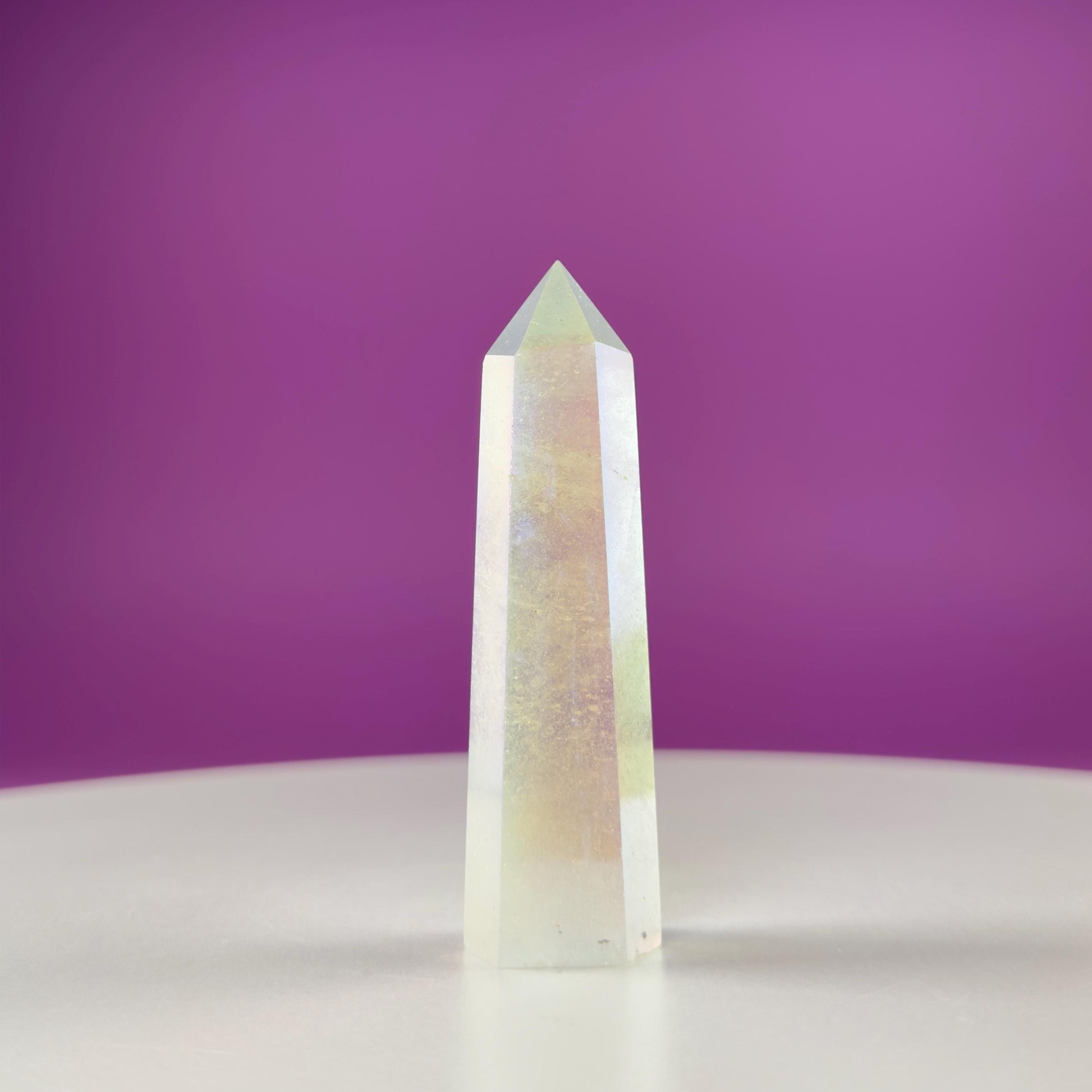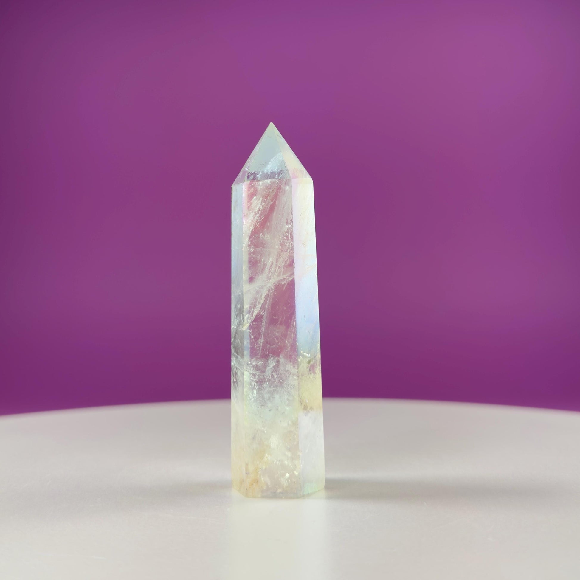 Angel Aura Quartz Towers shimmer with an otherworldly iridescence, offering a sense of peace, upliftment, and gentle clarity. Created by bonding Clear Quartz with precious metals, this crystal carries a high, soothing vibration that supports emotional balance and spiritual connection.