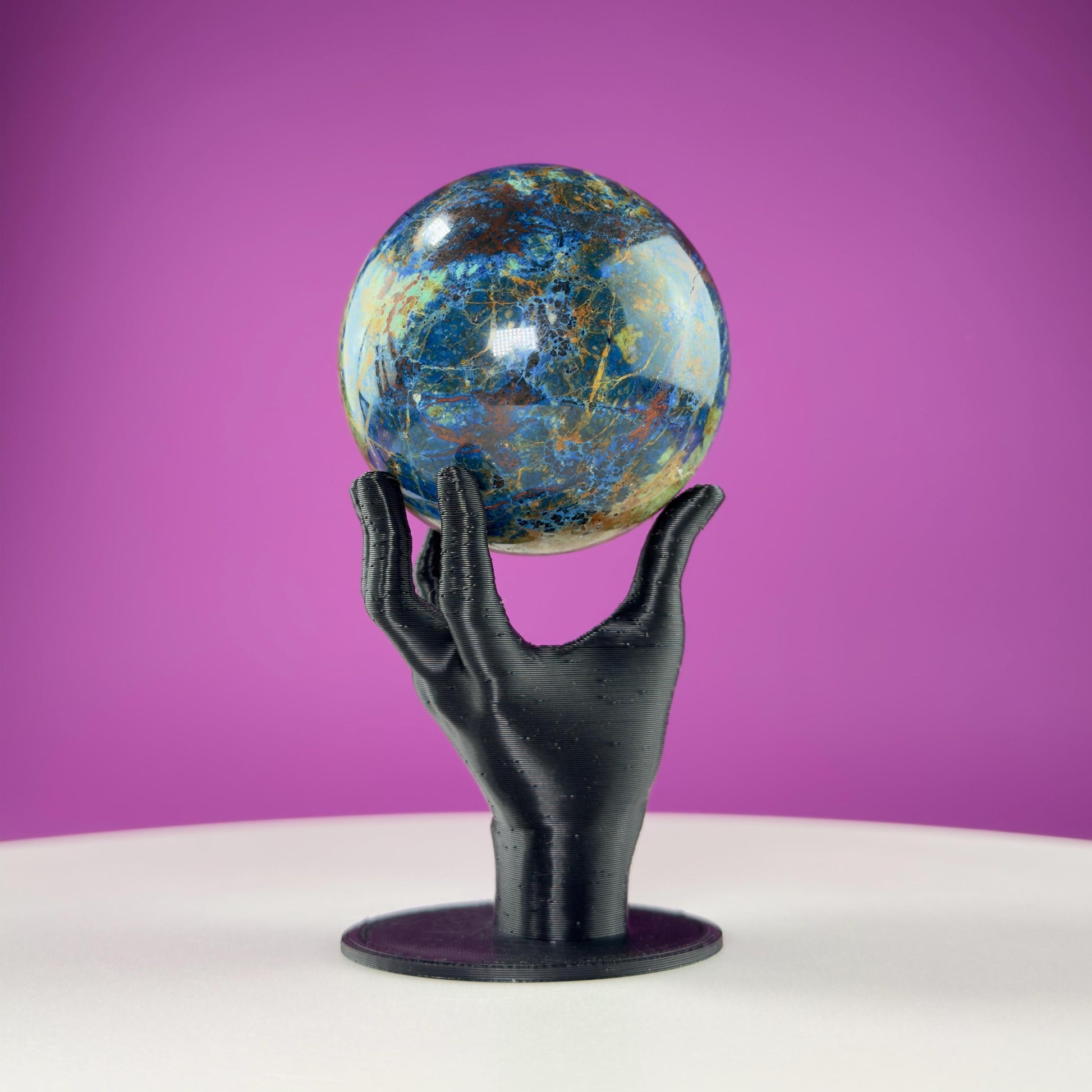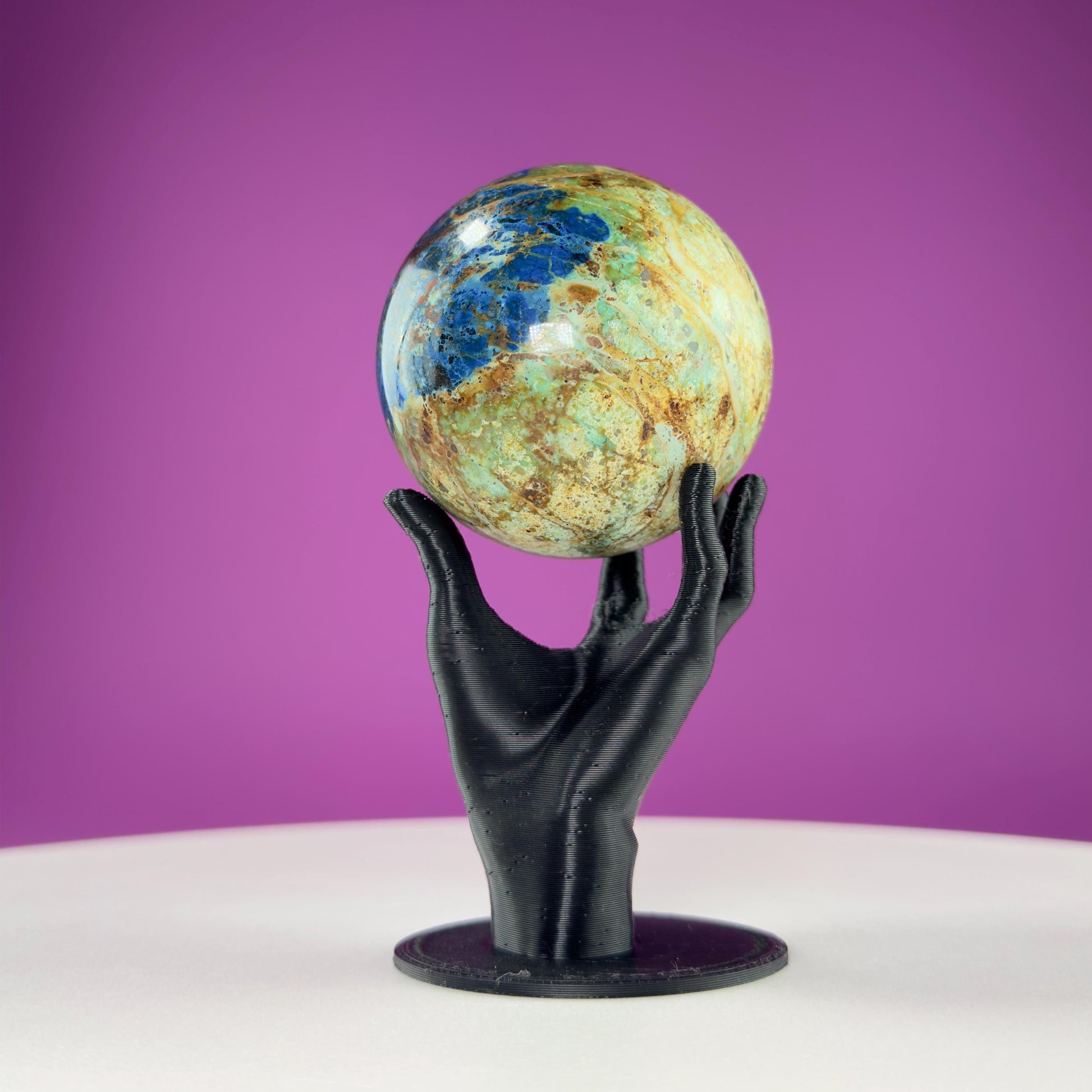 Transform any space into a sanctuary of natural beauty with this stunning Azurite and Malachite Sphere paired with its elegant Black Hand Sphere Stand! This mesmerizing crystal sphere showcases the breathtaking contrast between deep azure blues and malachite greens, creating swirling patterns that seem to dance before your eyes. This sphere is a unique work of art, displaying nature‘s incredible ability to blend these two powerful minerals into one captivating piece. The smooth, polished surface invites touch while radiating the harmonious energies these stones are renowned for - azurite‘s ability to enhance intuition and clarity, combined with malachite‘s protective and transformative properties. Perfectly complemented by the sleek black handstand, this sphere becomes an instant focal point whether displayed on your desk, meditation altar, or living room shelf. The stand, made of PLA plastic and is created via a 3d printer, ensures your precious sphere remains secure while allowing you to appreciate its beauty from every angle. Whether you‘re a crystal enthusiast, interior design lover, or someone seeking to bring more positive energy into your environment, this azurite and malachite sphere will elevate your space with its natural magnificence and powerful vibrations!