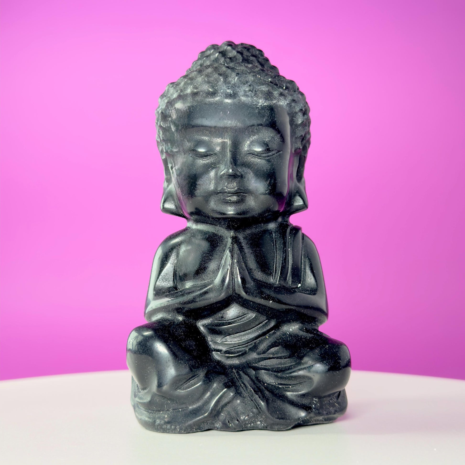 This Black Obsidian Baby Buddha is a substantial 884-gram carving designed to anchor your sacred space with calm authority and protective energy. The serene expression and prayerful posture symbolize mindfulness, inner balance, and spiritual discipline — while the deep, polished obsidian radiates grounding strength.