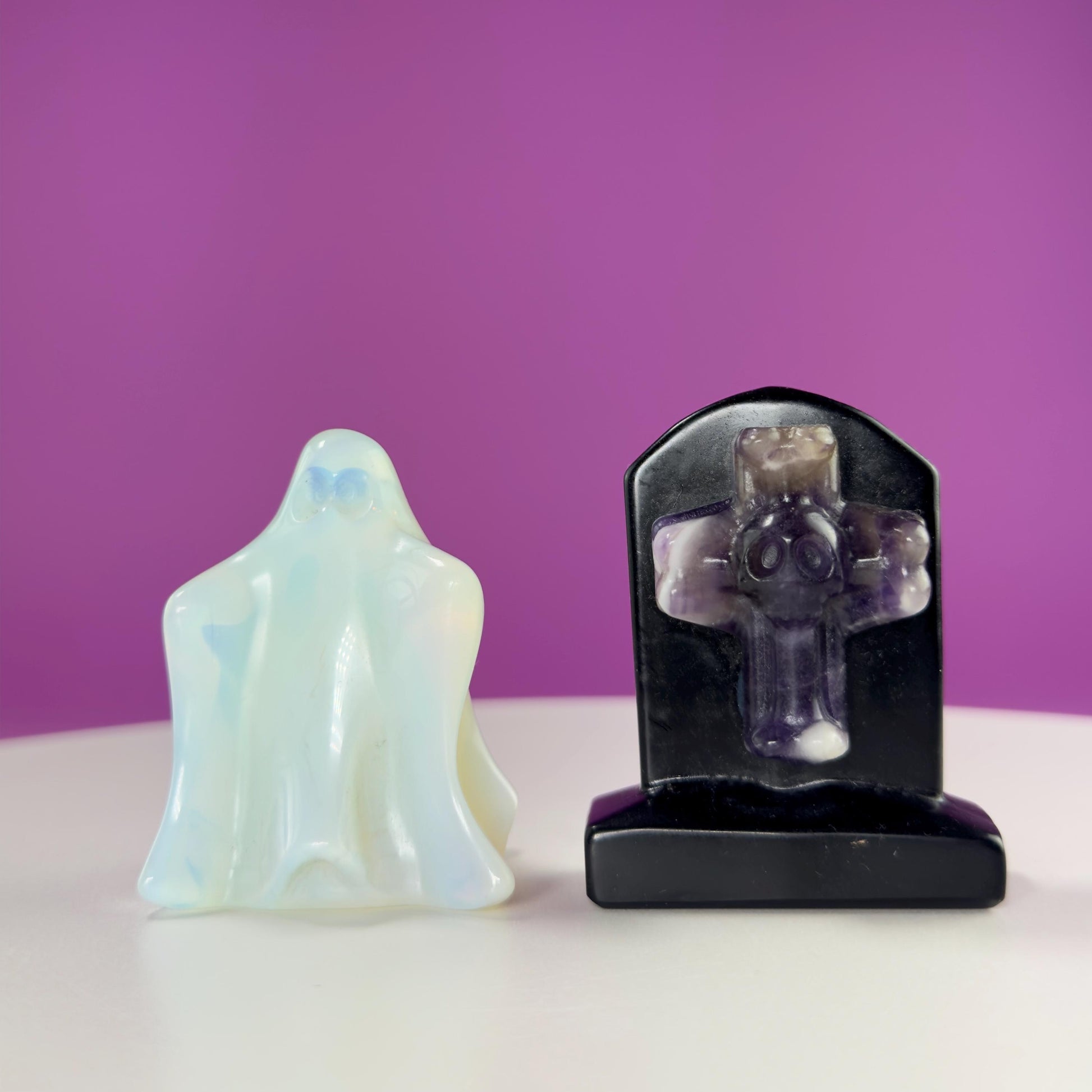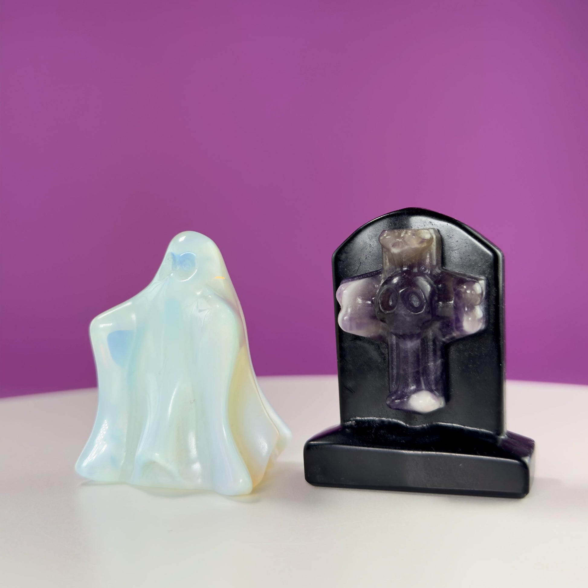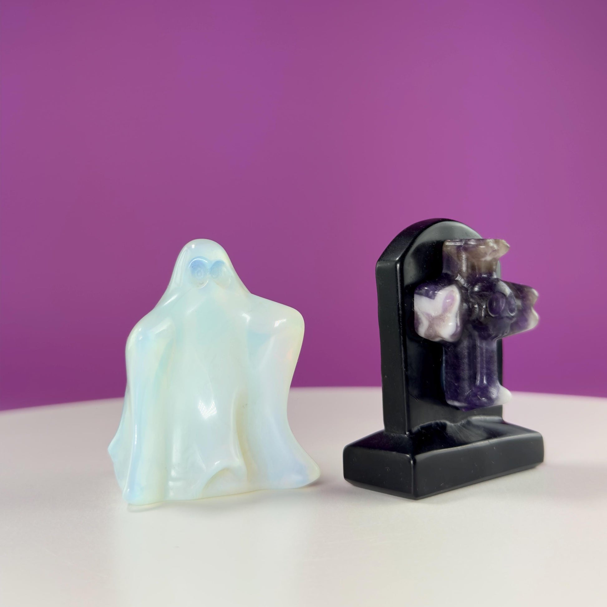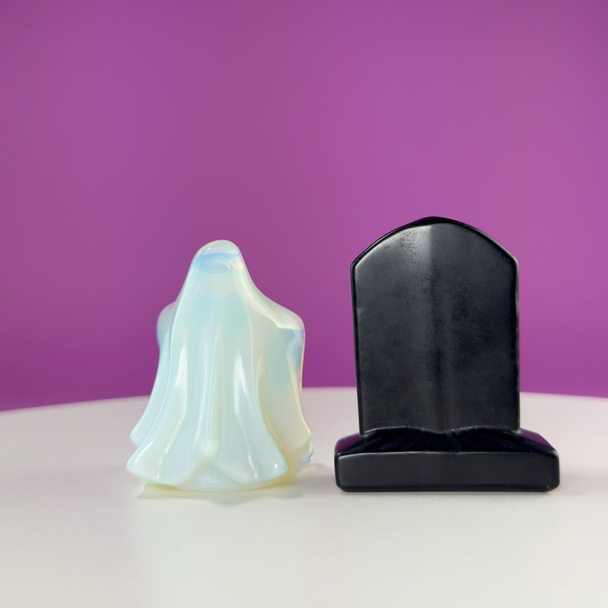 Embrace the mystique of the afterlife with this hauntingly beautiful Black Obsidian Skull Headstone and Opalite Ghost Carving set! The deep, mirror-like surface of the black obsidian commands attention with its powerful presence, while the ethereal opalite ghost seems to float beside it with an otherworldly glow. Black obsidian, known as nature‘s glass, is revered for its protective qualities and ability to shield against negative energies, making this skull headstone a formidable guardian for your Halloween space. The translucent opalite ghost shimmers with soft whites, believed to enhance communication with higher realms and promote peaceful transitions. Together, these carvings create a captivating display that honors the cycle of life and death while serving as powerful spiritual allies. Whether you‘re drawn to their gothic elegance, seeking protection during shadow work, or simply appreciate their artistic beauty, this duo transforms any shelf or space into a portal of mystical energy!