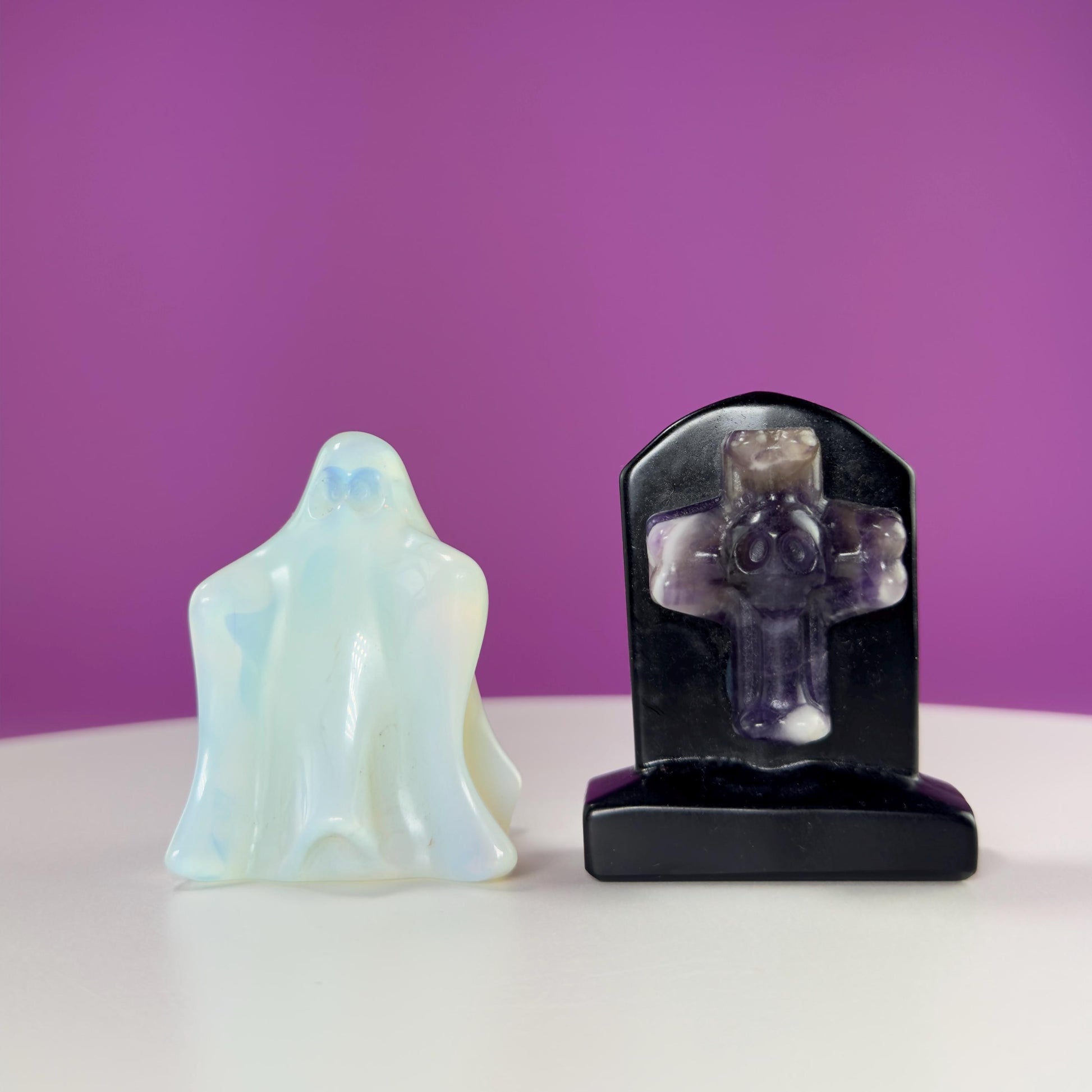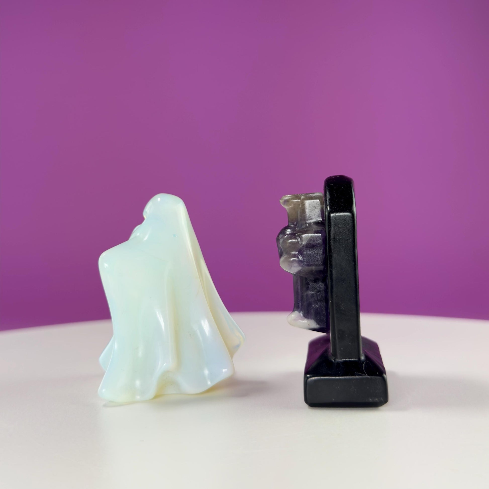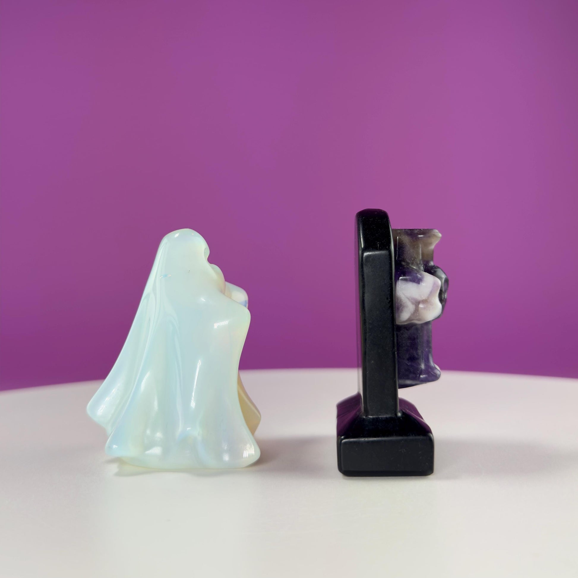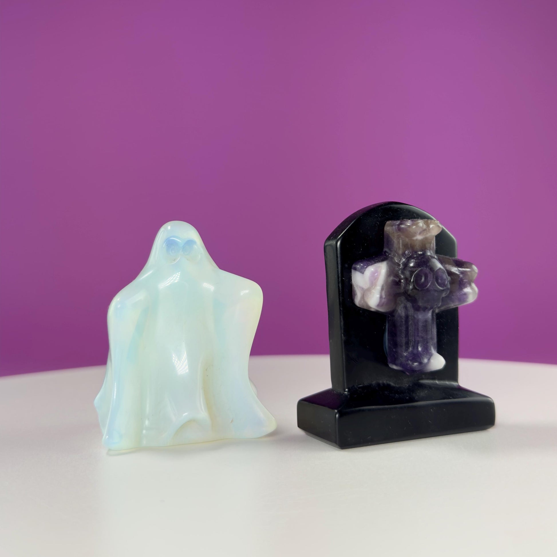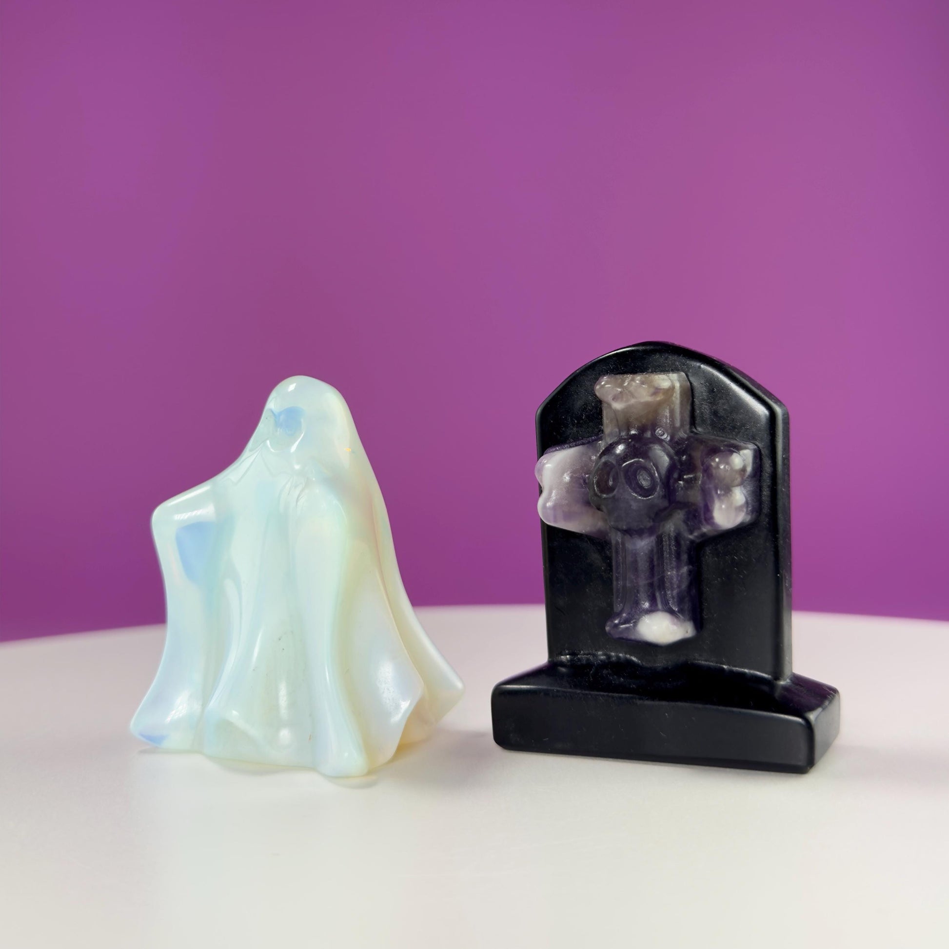 Embrace the mystique of the afterlife with this hauntingly beautiful Black Obsidian Skull Headstone and Opalite Ghost Carving set! The deep, mirror-like surface of the black obsidian commands attention with its powerful presence, while the ethereal opalite ghost seems to float beside it with an otherworldly glow. Black obsidian, known as nature‘s glass, is revered for its protective qualities and ability to shield against negative energies, making this skull headstone a formidable guardian for your Halloween space. The translucent opalite ghost shimmers with soft whites, believed to enhance communication with higher realms and promote peaceful transitions. Together, these carvings create a captivating display that honors the cycle of life and death while serving as powerful spiritual allies. Whether you‘re drawn to their gothic elegance, seeking protection during shadow work, or simply appreciate their artistic beauty, this duo transforms any shelf or space into a portal of mystical energy!