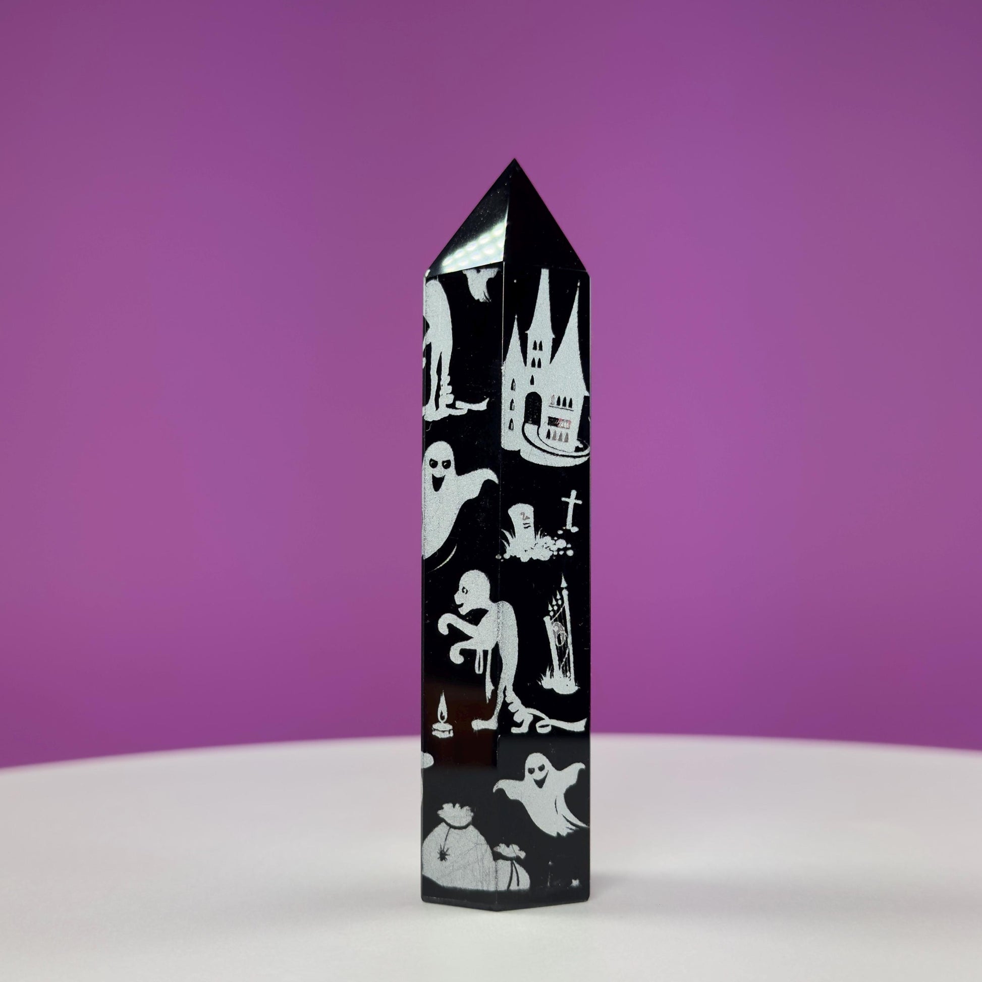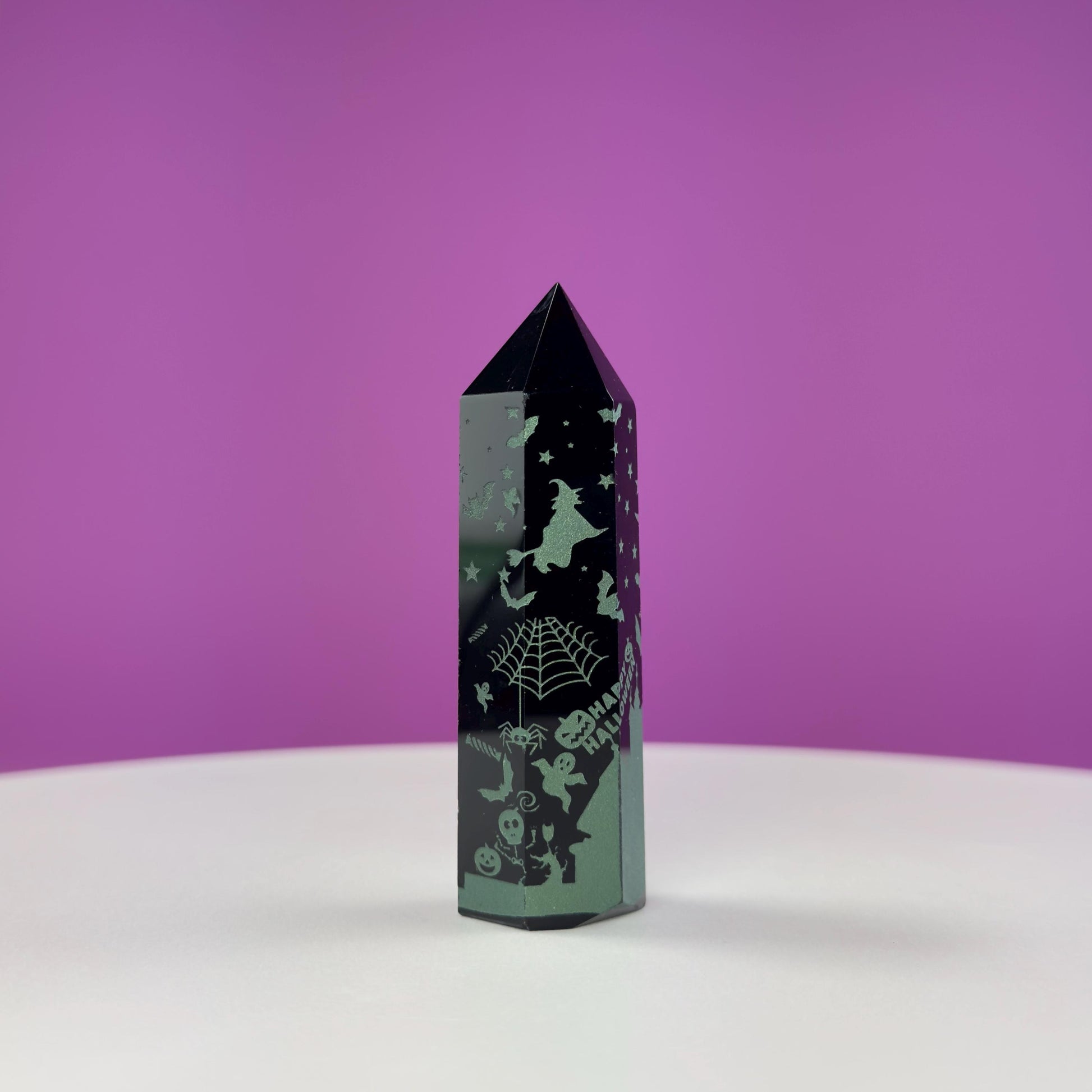 Embrace the mystical energy of our stunning Black Obsidian Tower adorned with enchanting Halloween graphics! These captivating towers combines the powerful protective properties of natural black obsidian with festive seasonal charm, making it the perfect addition to your Halloween décor or year-round crystal collection. Standing tall and elegant, this tower harnesses obsidian‘s renowned ability to shield against negative energies while grounding your spirit during the magical autumn season. The intricate Halloween-themed graphics add a delightful touch of whimsy, featuring classic symbols that celebrate the season‘s mysterious allure. Whether you‘re creating a spooky altar, enhancing your meditation space, or simply looking for a unique decorative piece that radiates both beauty and protection, this Black Obsidian Tower delivers! Its sleek surface reflects light beautifully, creating a mesmerizing focal point in any room, while its weight provides a satisfying, grounding presence in your hands during meditation or energy work.