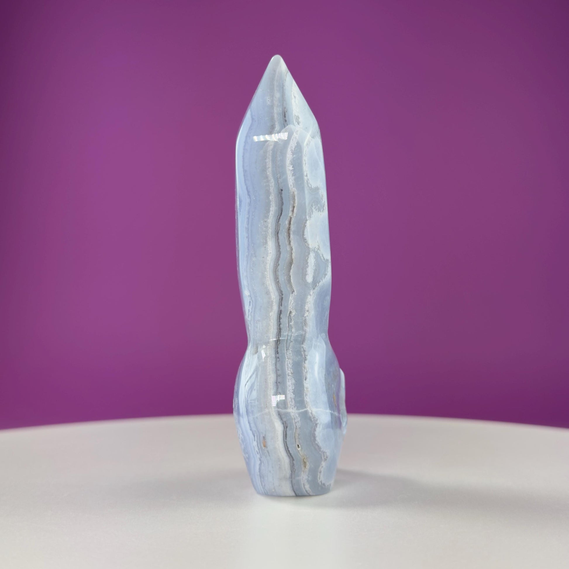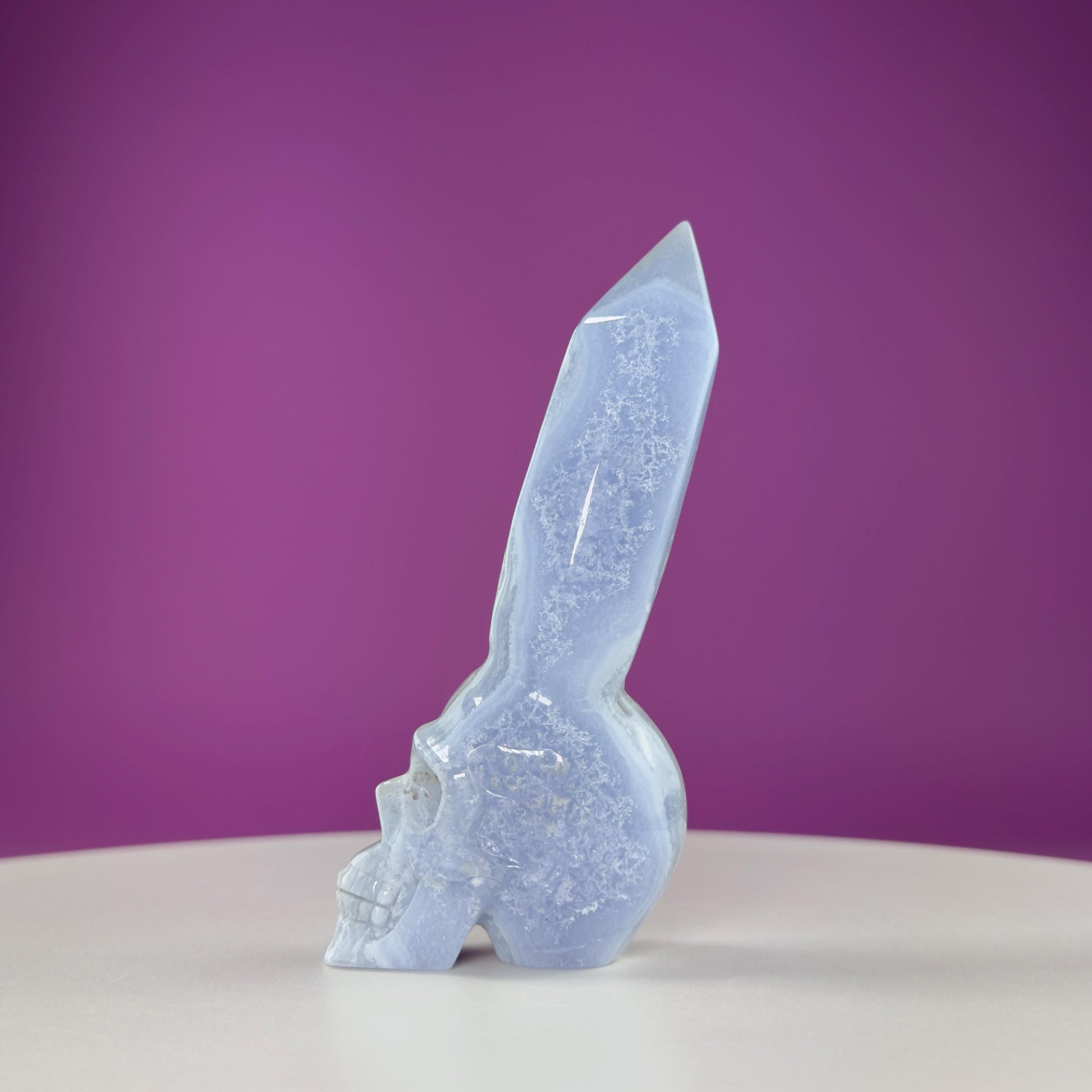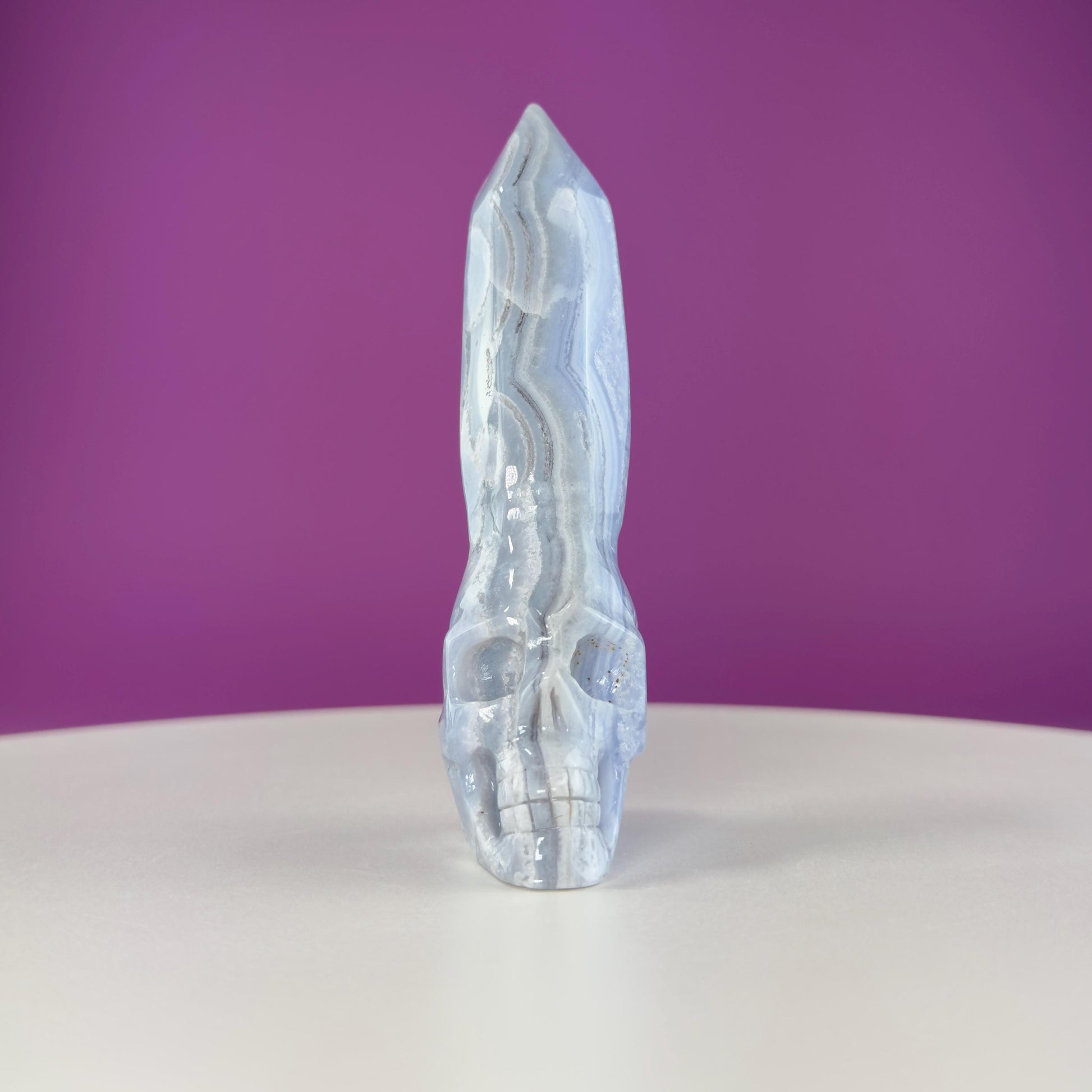 Don‘t miss the chance to add this unique Blue Lace Agate Skull with Generator to your collection. Explore its calming energy and let it inspire clear, heartfelt communication in your life.