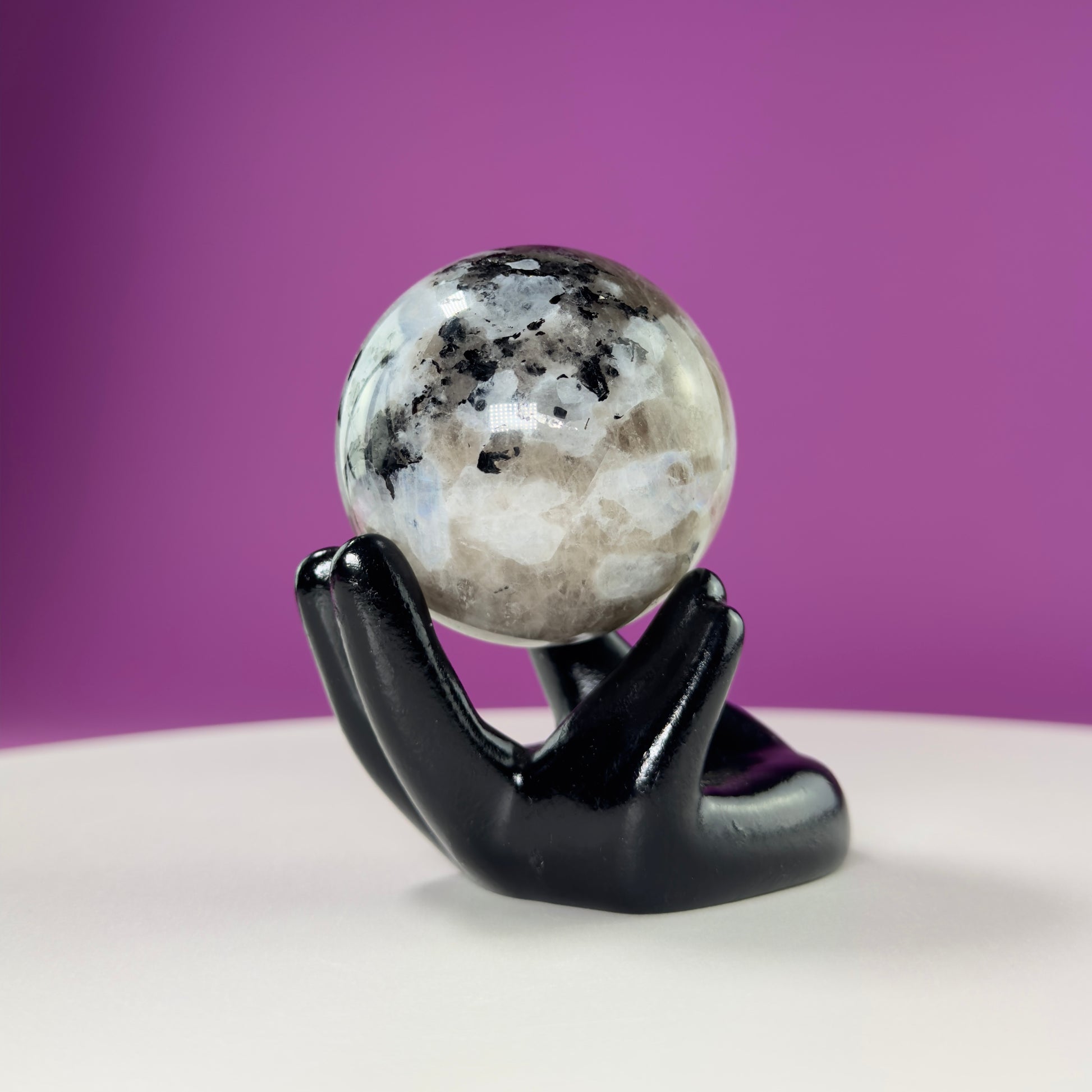 This listing is for one (1) polished Blue Moonstone Sphere and Black Hand Stand. The one in the photograph is the one you receive.