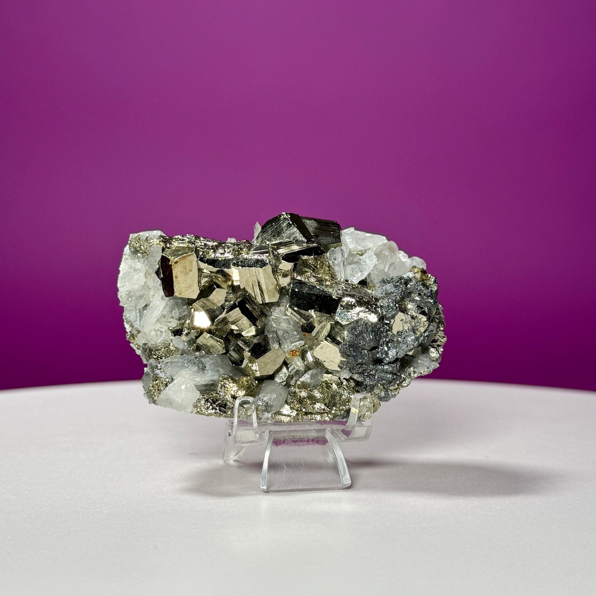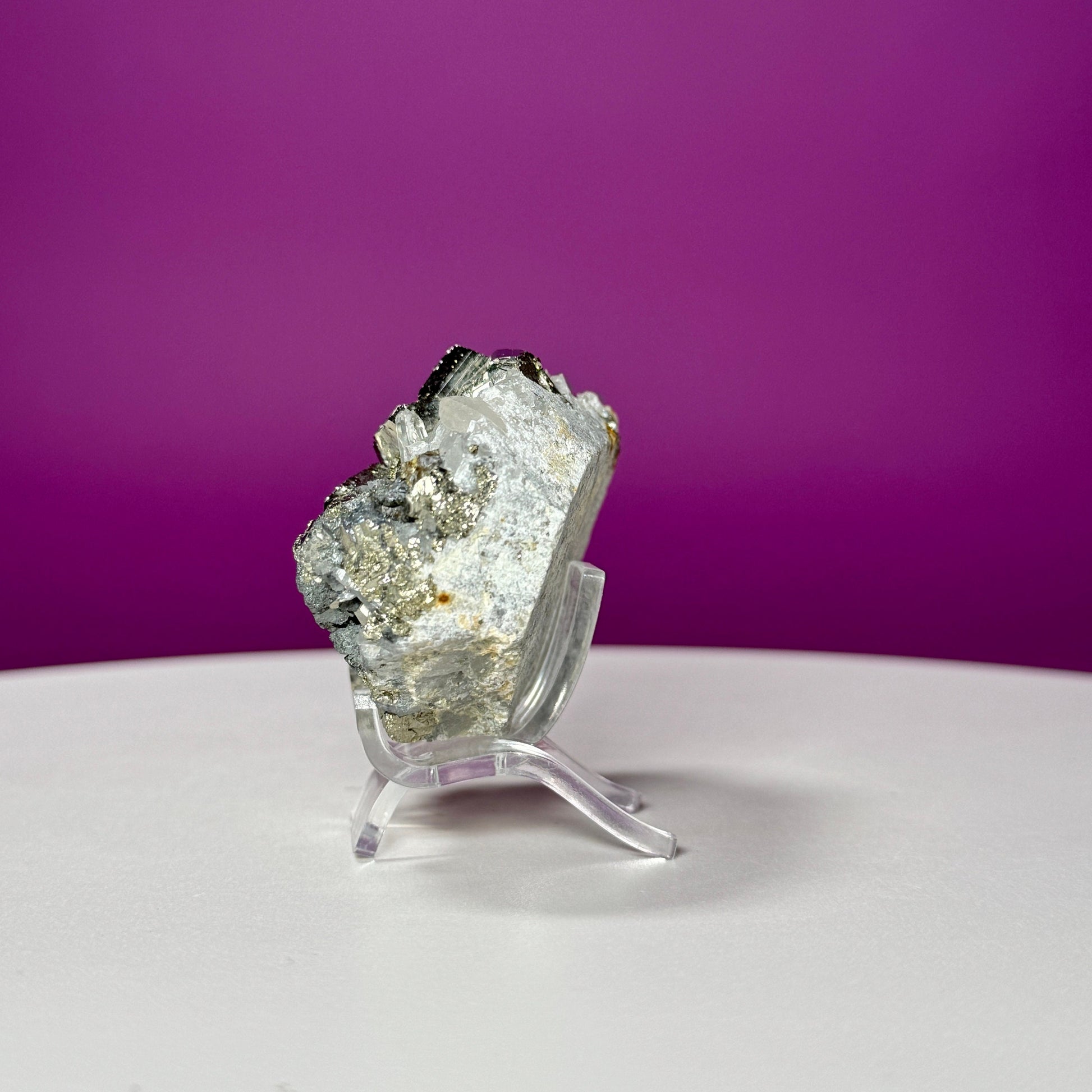 This listing is for one (1) Chalcopyrite on Quartz Specimen and acrylic stand. The one in the photograph is the one you receive.