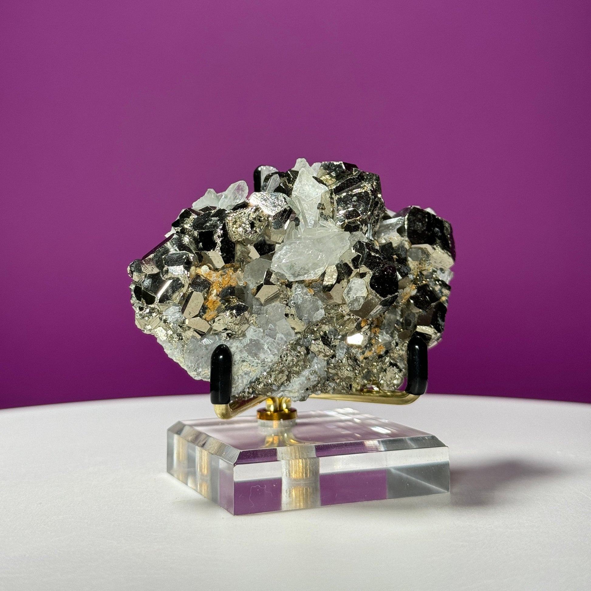 This listing is for one (1) Chalcopyrite on Quartz Specimen and metal/acrylic stand. The one in the photograph is the one you receive.