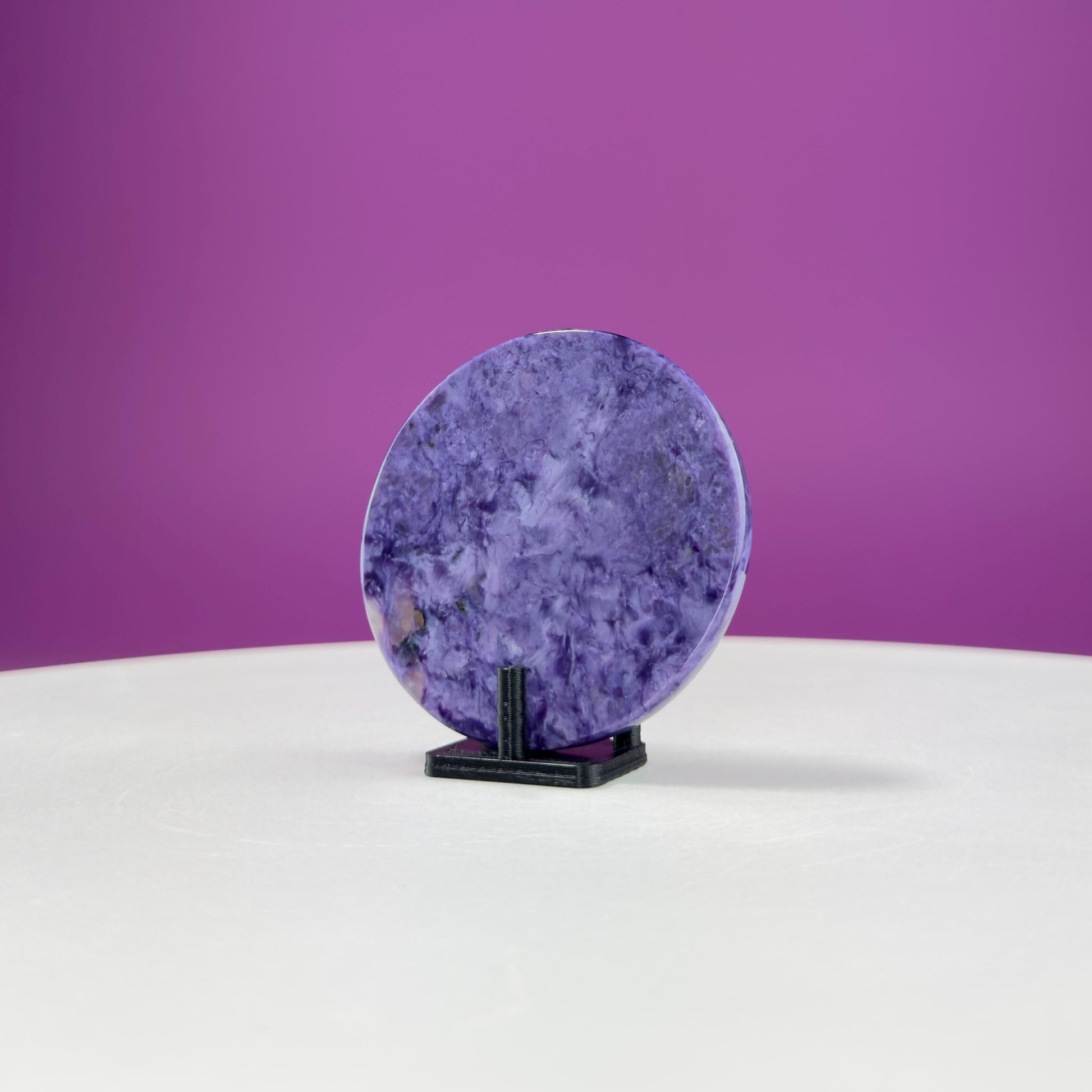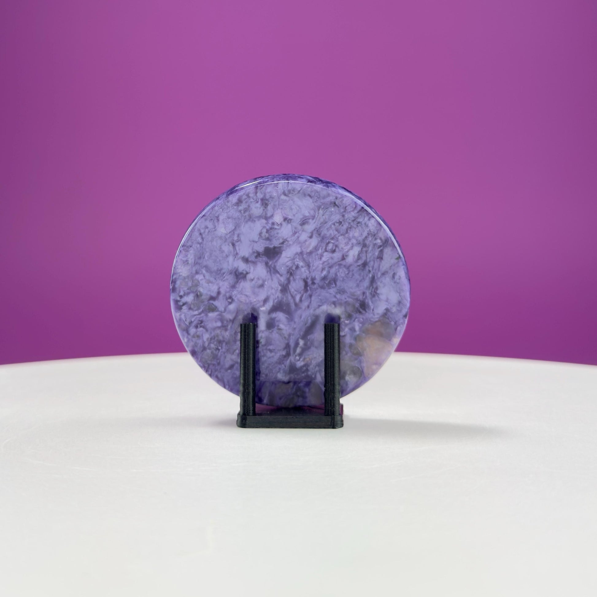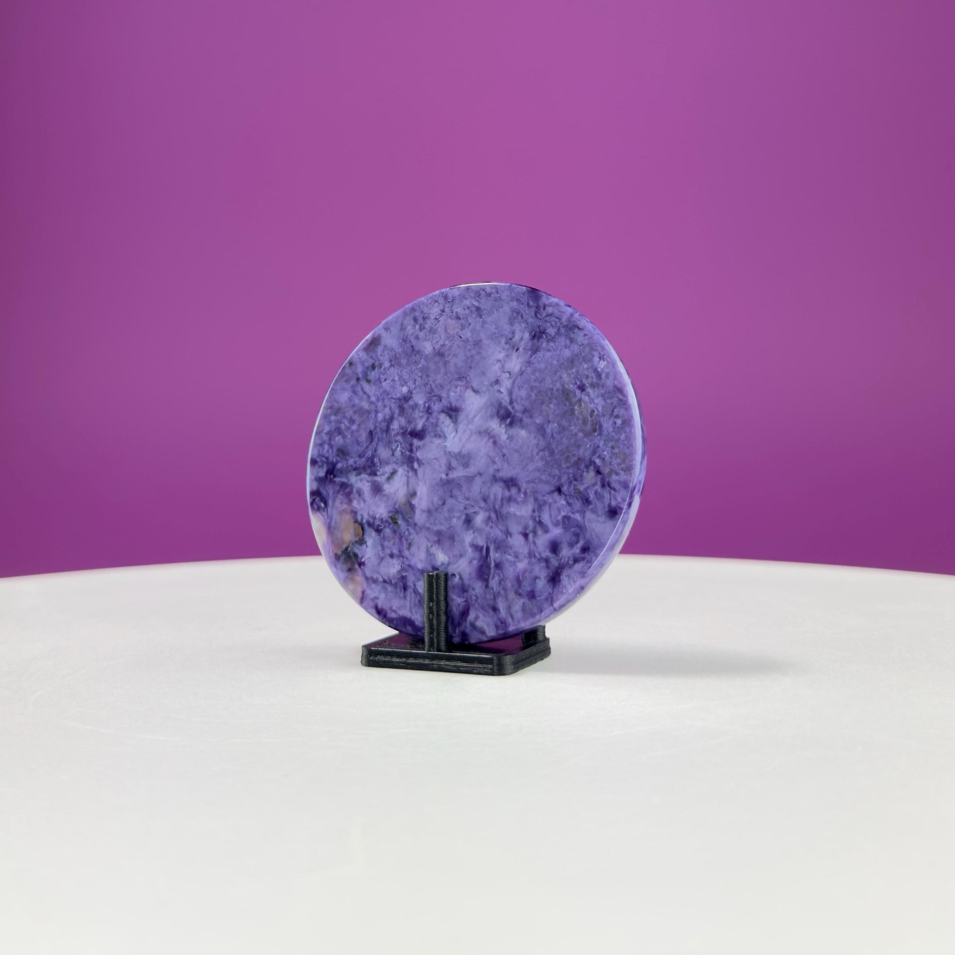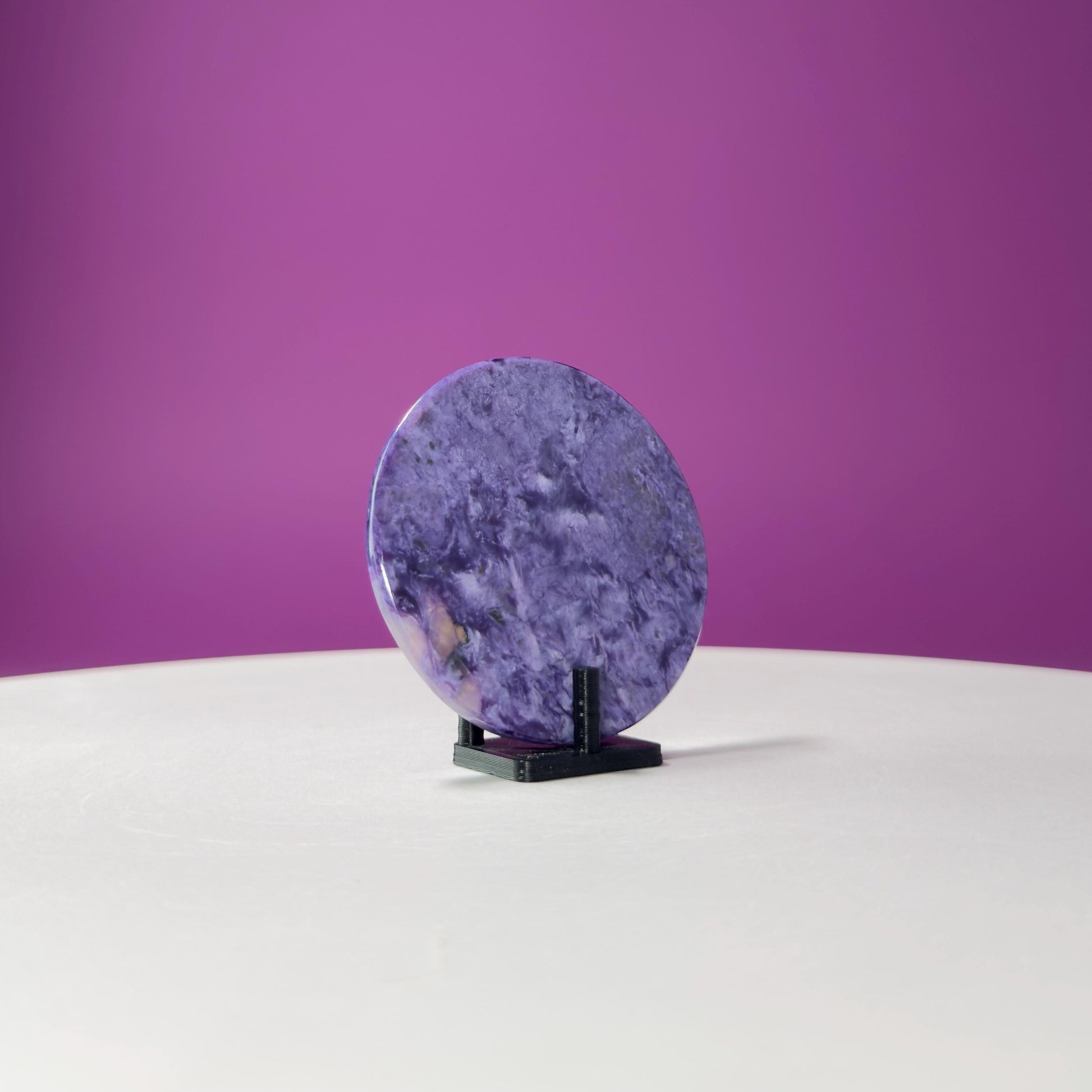 This listing is for one (1) Charoite Energy Disc and black stand. The one in the photograph is the one you receive.