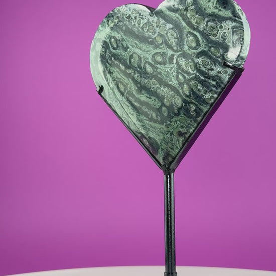 Bring the calming energy of nature right into your hands with this stunning Kambaba Jasper Heart Carving! Deep, mystic greens swirl with fossilized black orbs in this ancient stone, creating a pattern that looks like a lush, prehistoric ecosystem. Often called "Crocodile Jasper," each piece is unique and polished to a smooth, comforting finish that feels incredible to hold.