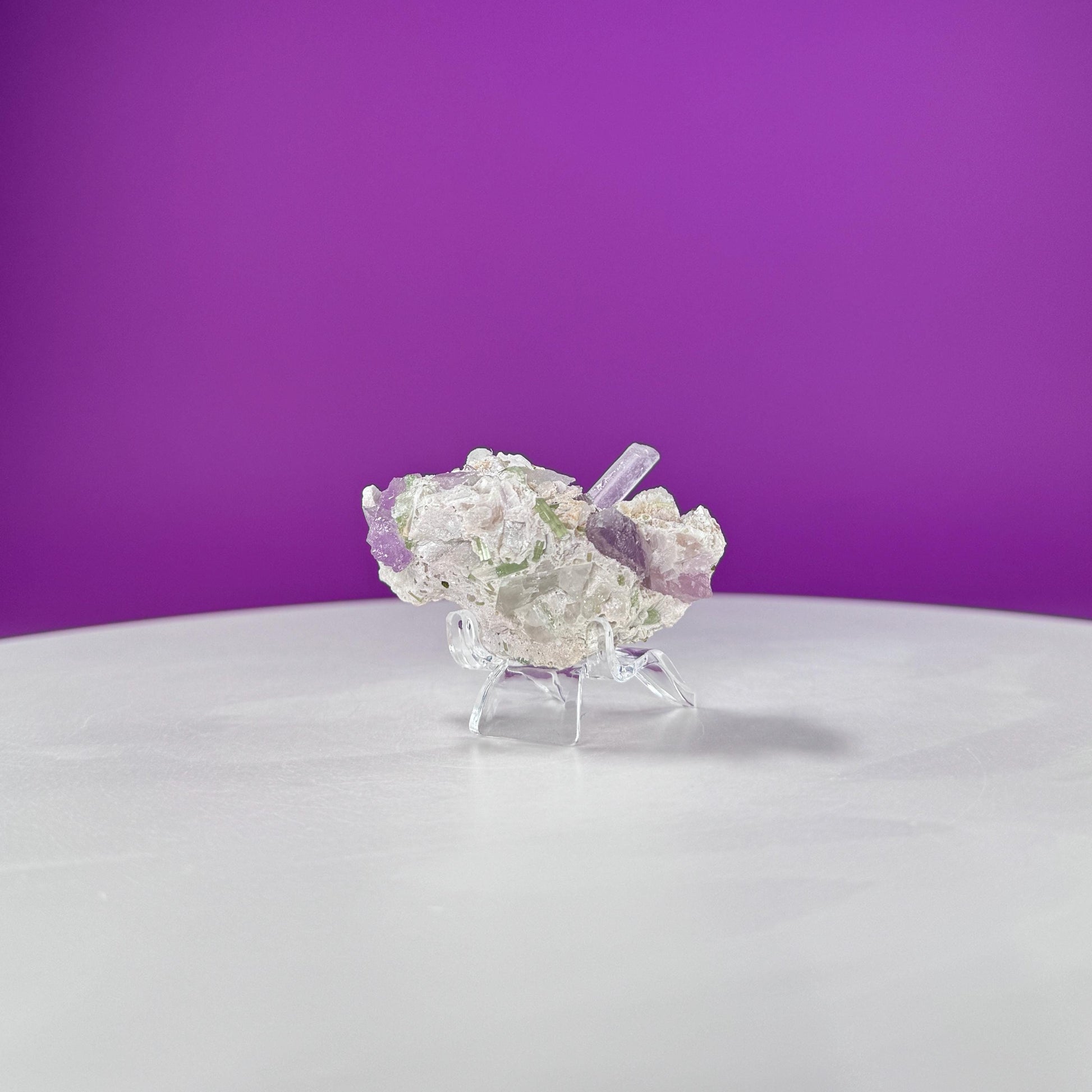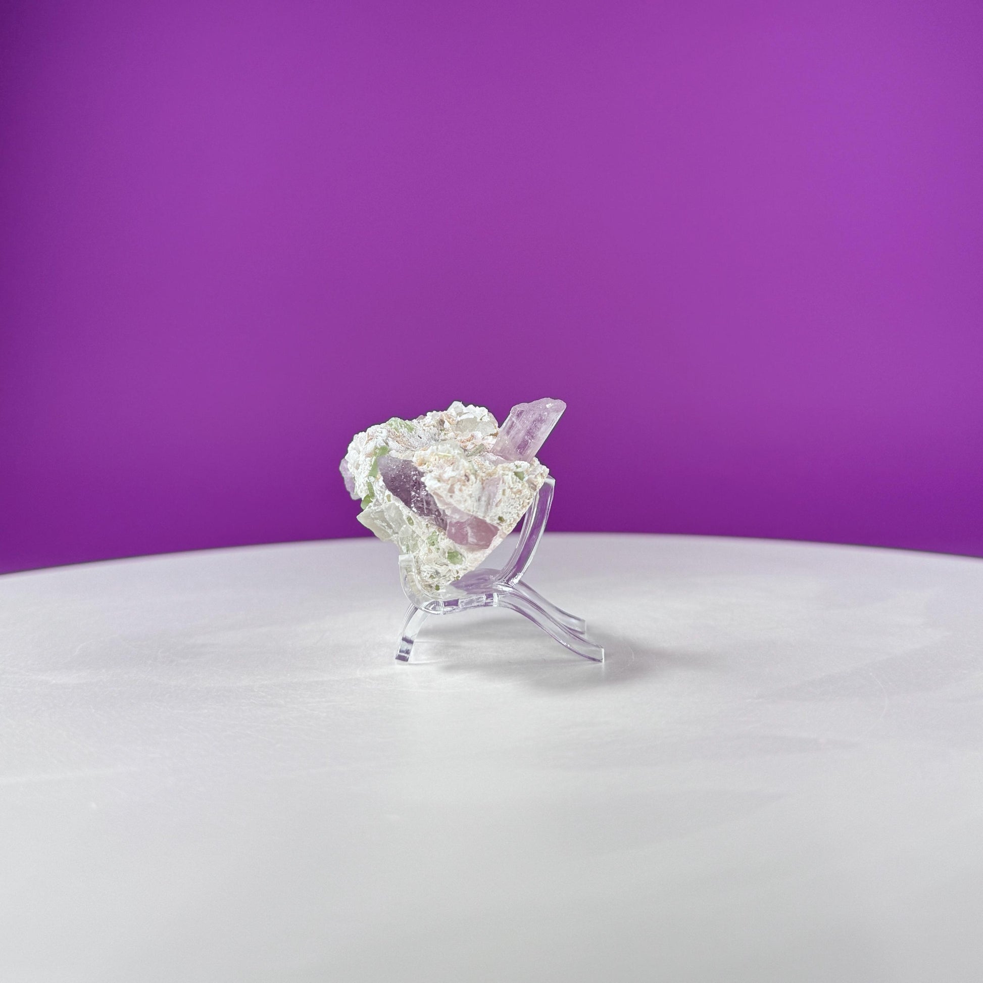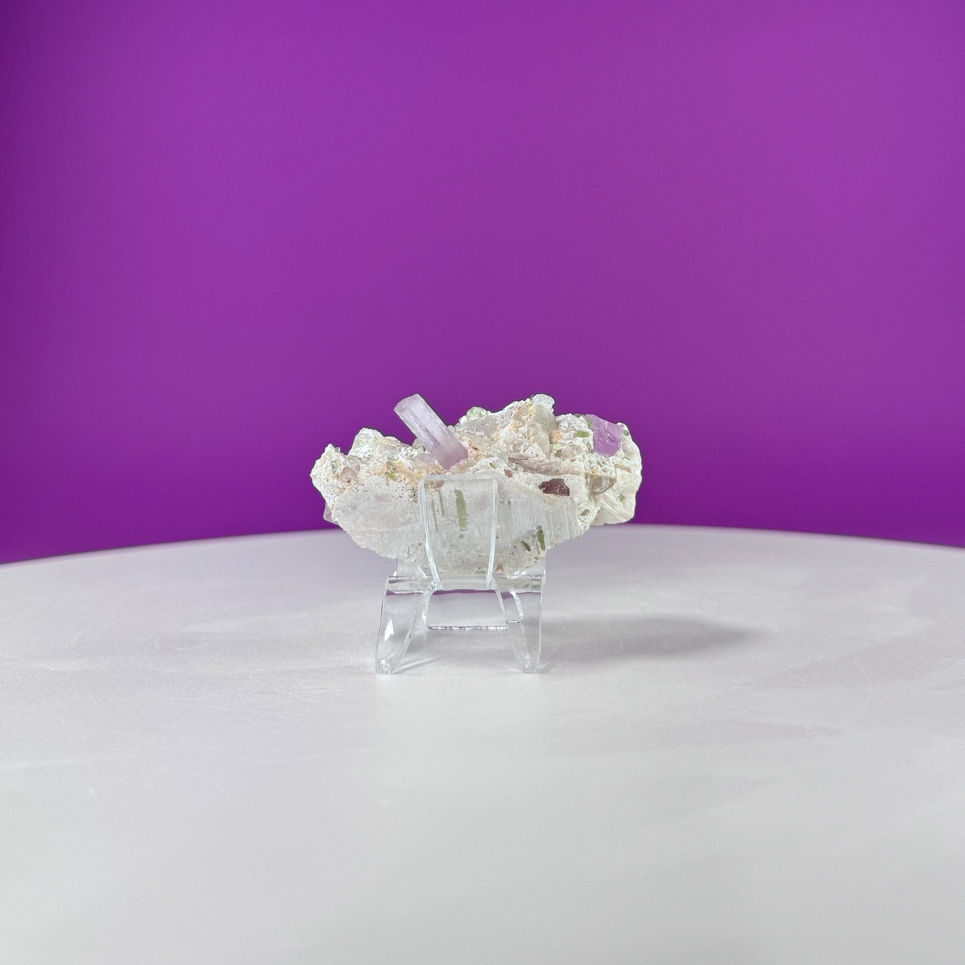 Kunzite with Green Tourmaline in Quartz Specimen (Includes Acrylic Stand)
