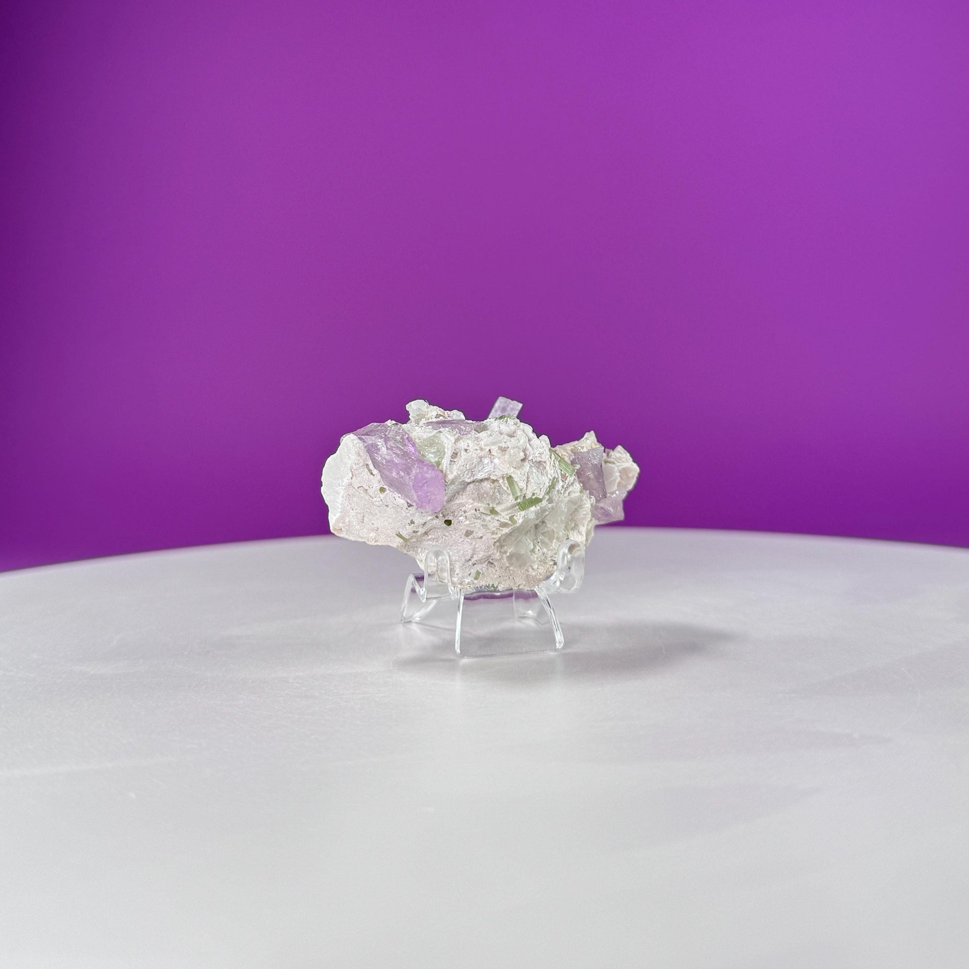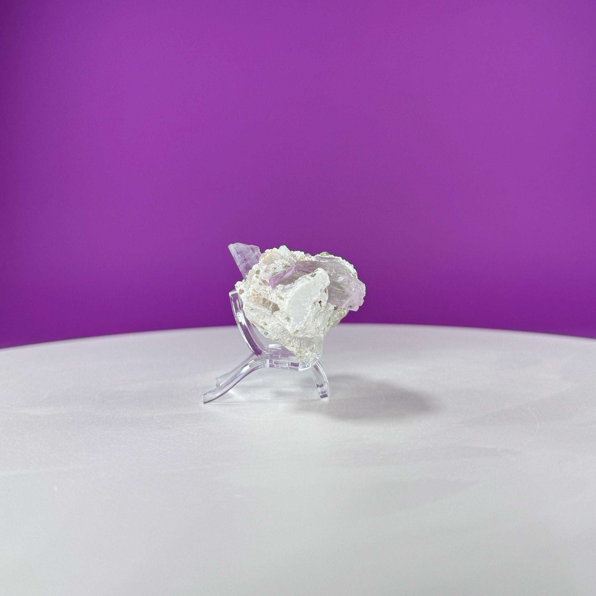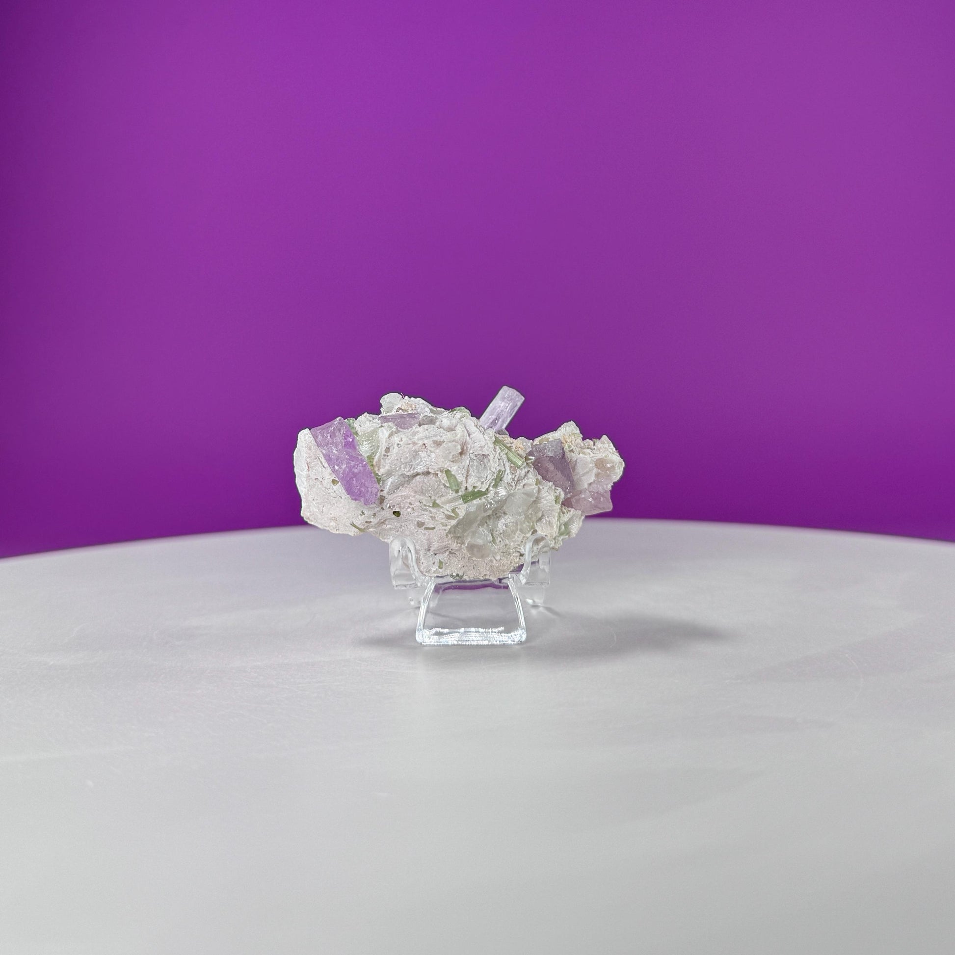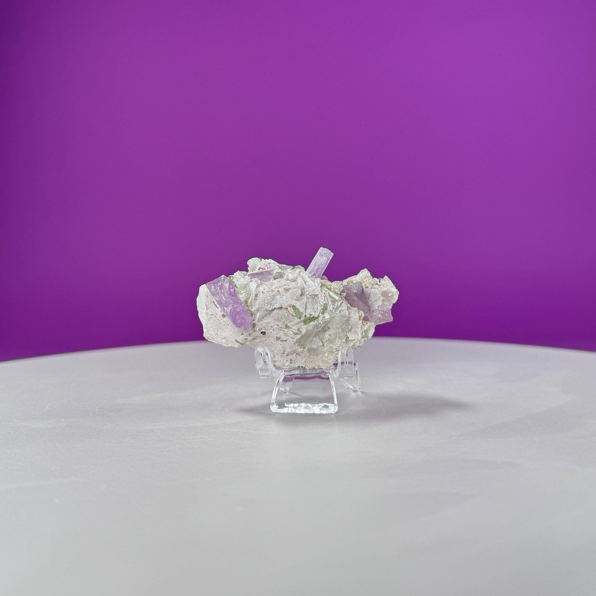 Kunzite with Green Tourmaline in Quartz Specimen (Includes Acrylic Stand)