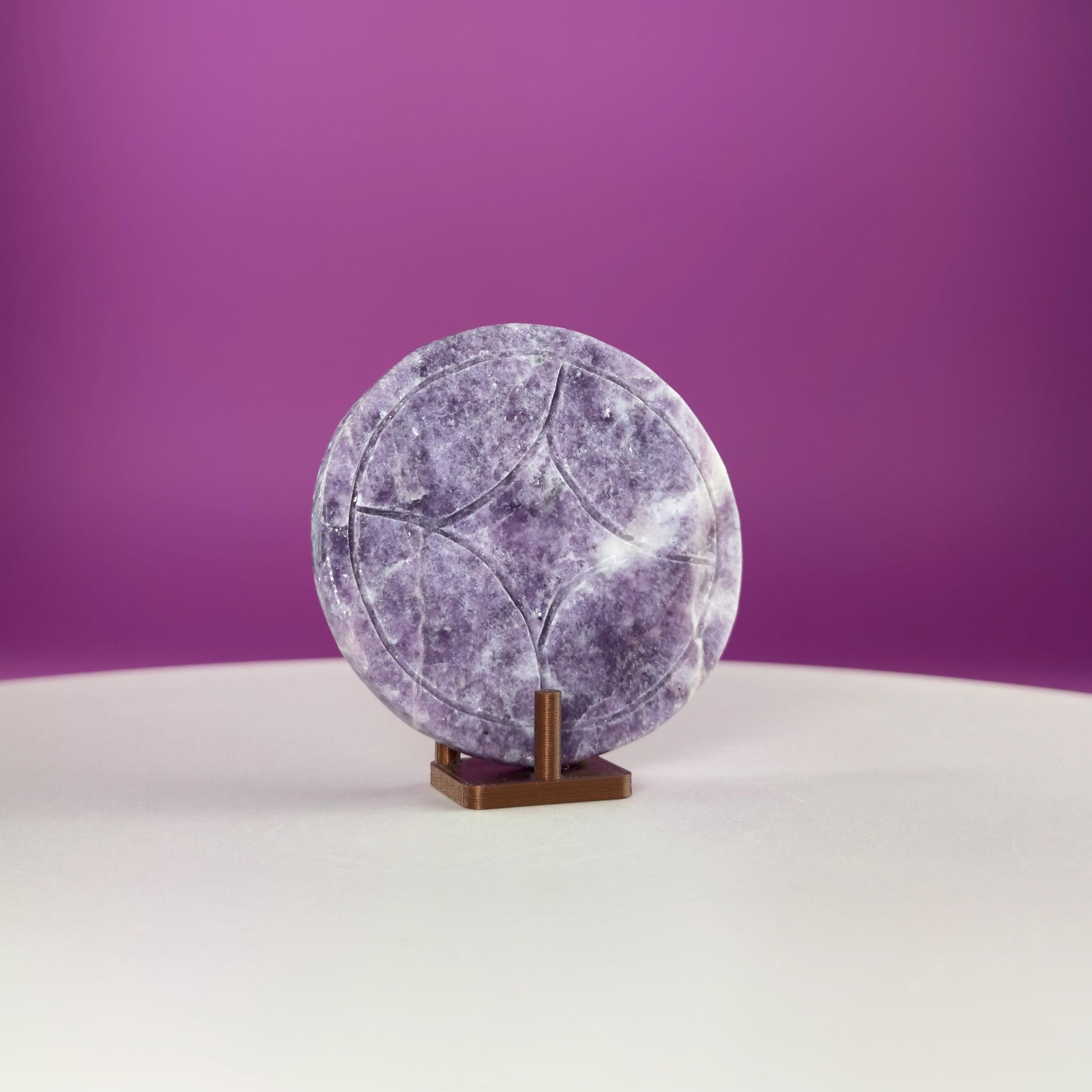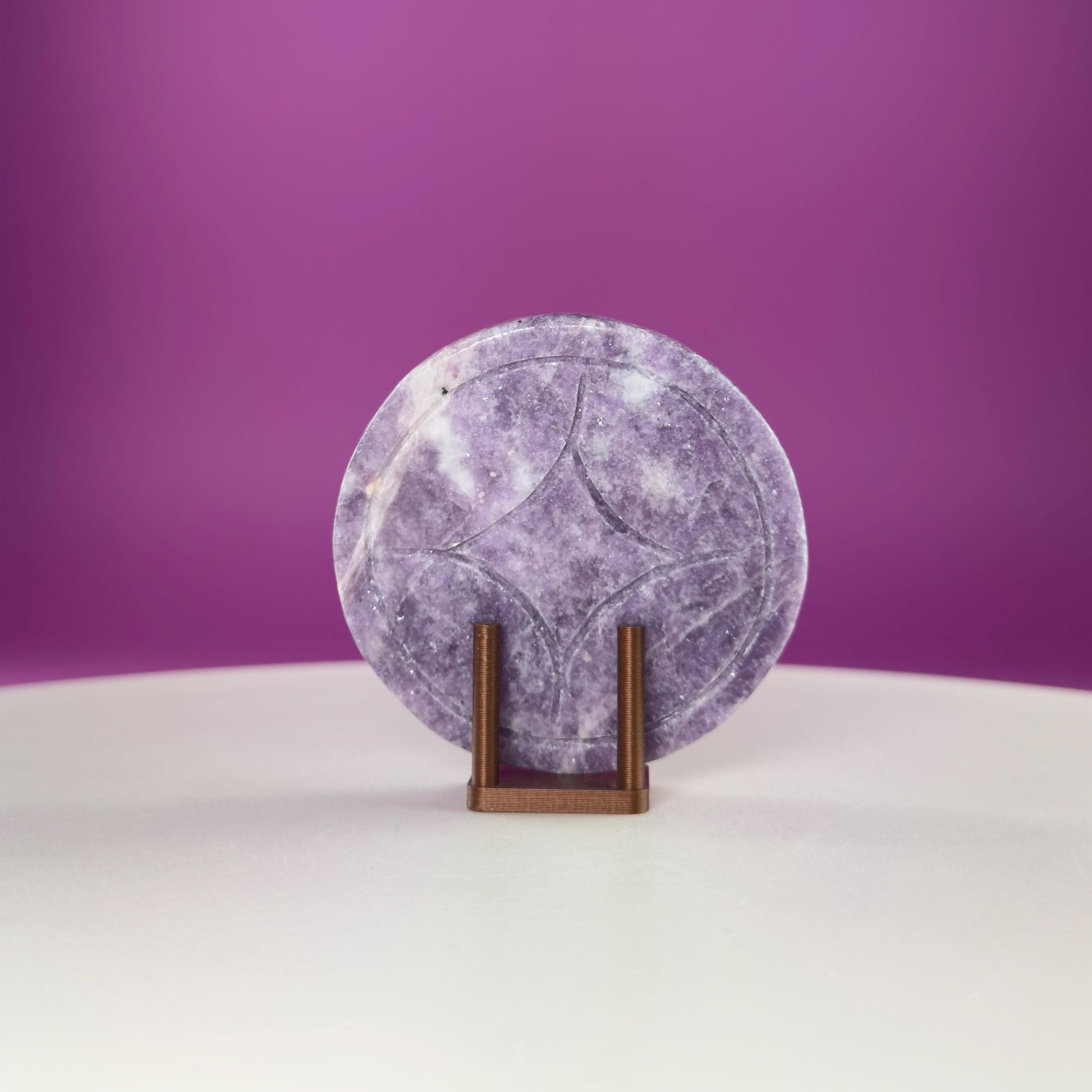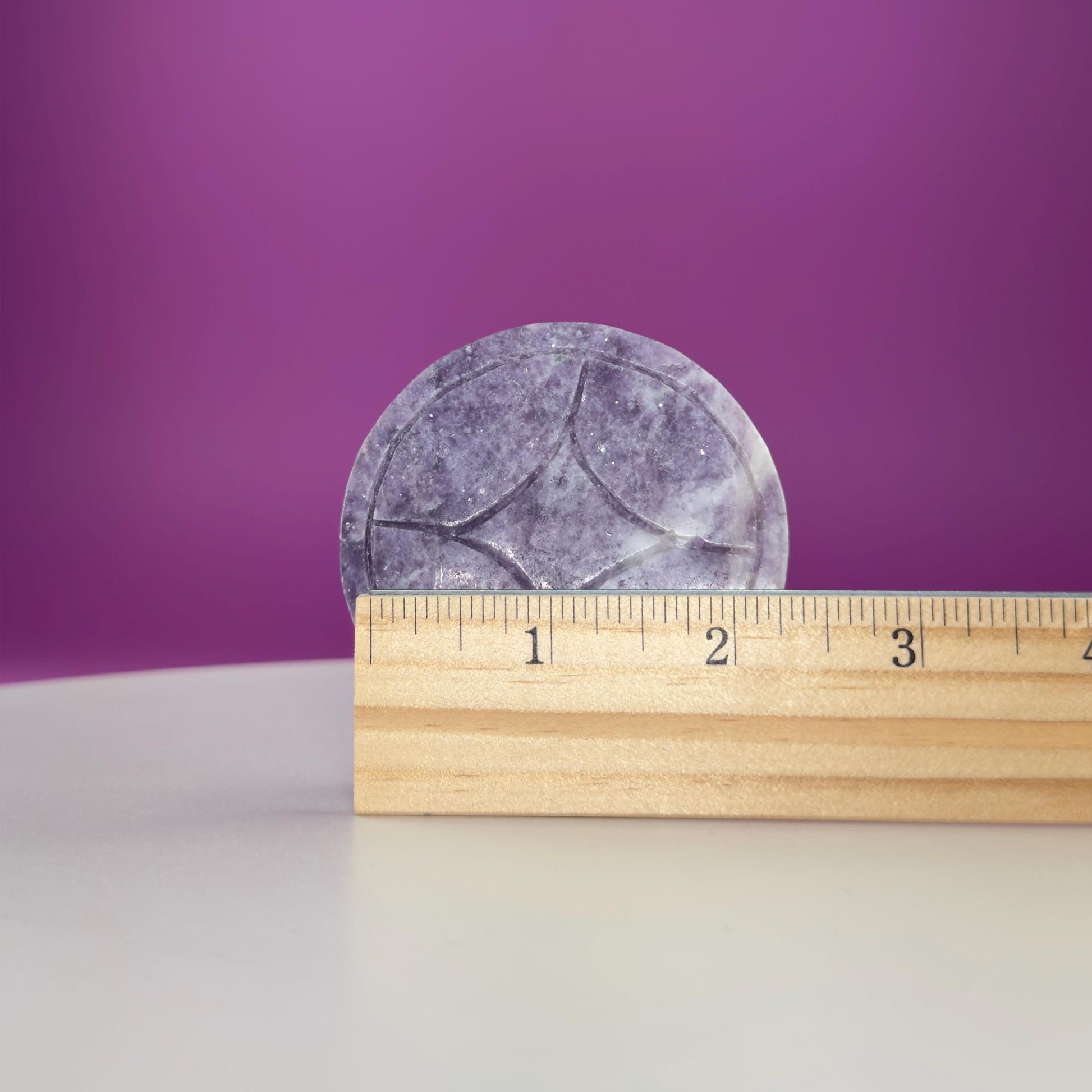 At 66 grams, this coin fits comfortably in the hand, making it ideal for palm meditation, altar displays, desk décor, or crystal grids. Lepidolite’s soft lavender tones shimmer with natural mica inclusions, giving each piece a gentle sparkle and soothing visual appeal.