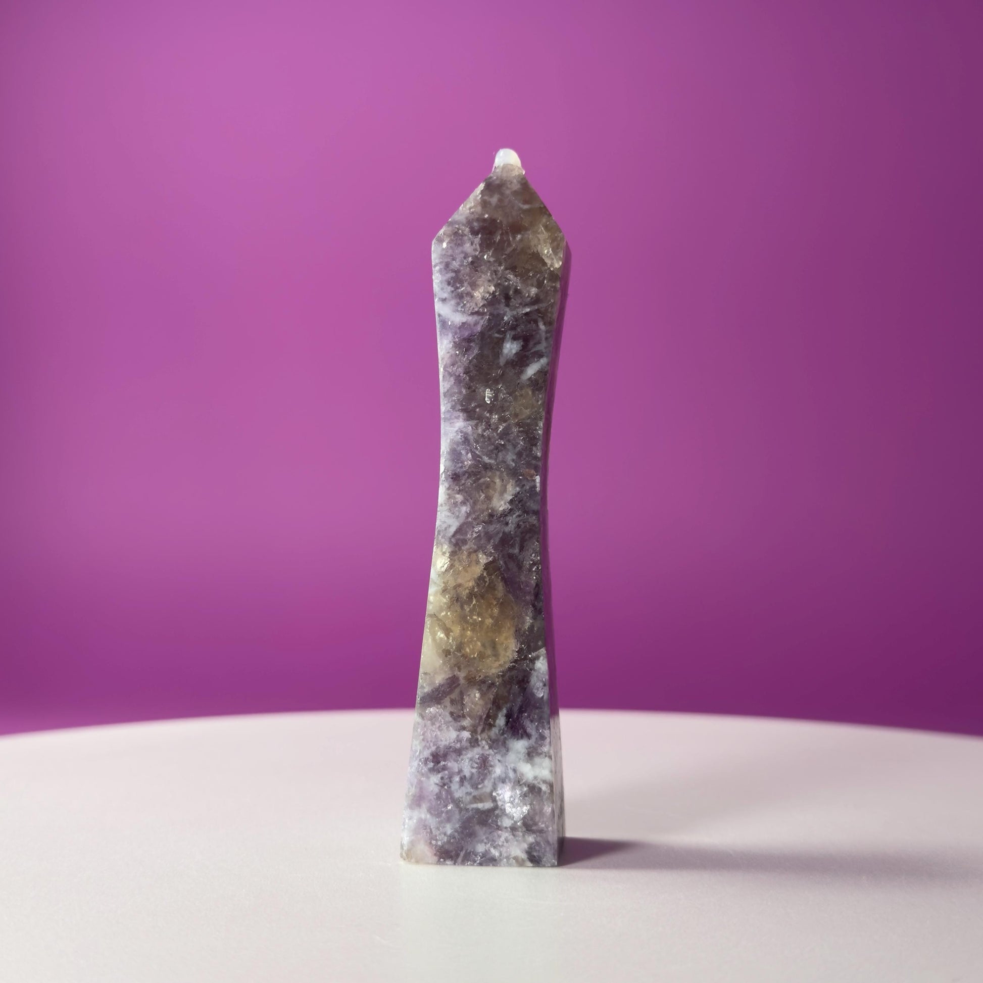 This Lepidolite and Smoky Quartz Tower blends two powerful calming and grounding stones into one beautifully polished crystal point. Lepidolite is known for its soothing energy and emotional support, while Smoky Quartz is valued for grounding, protection, and clearing heavy energy.