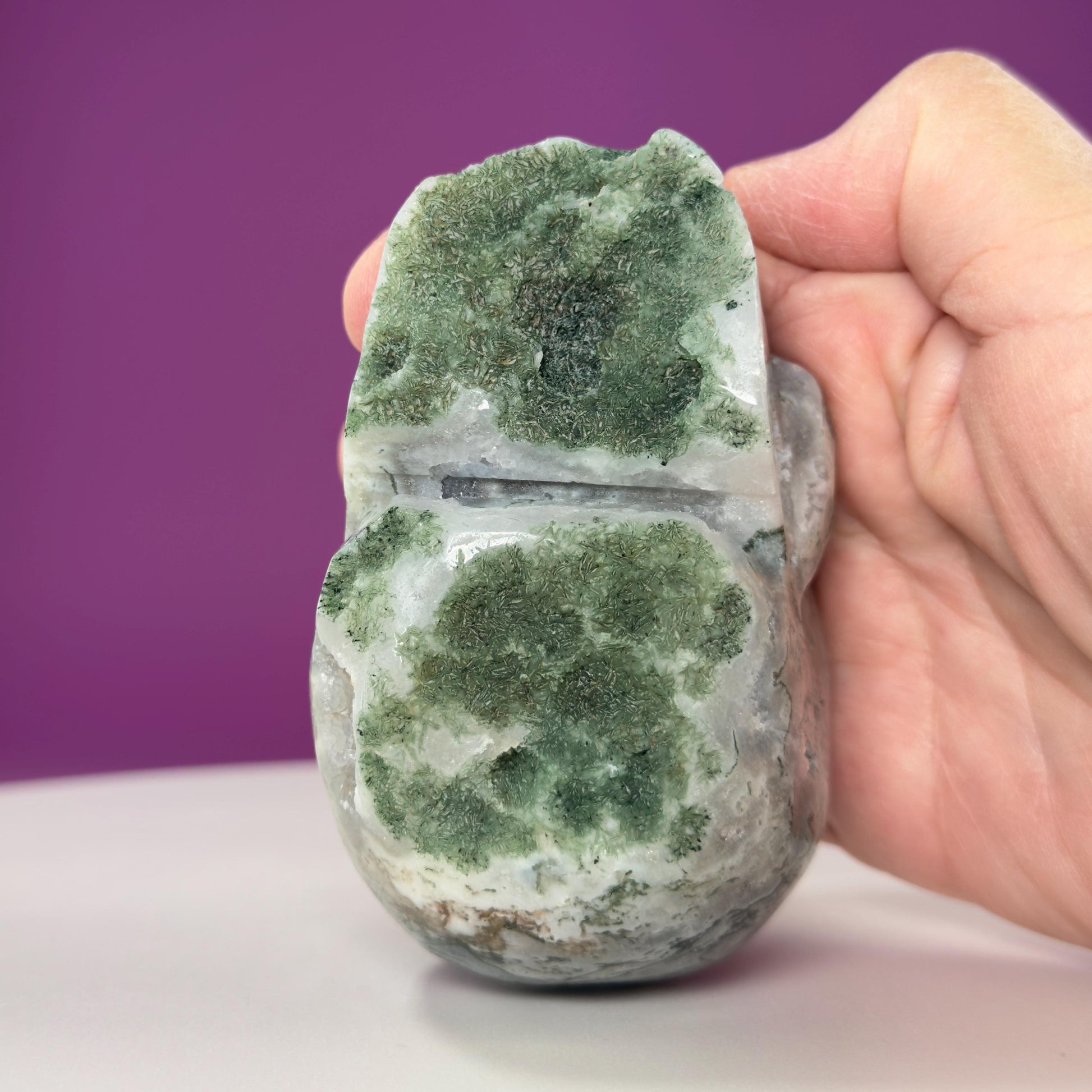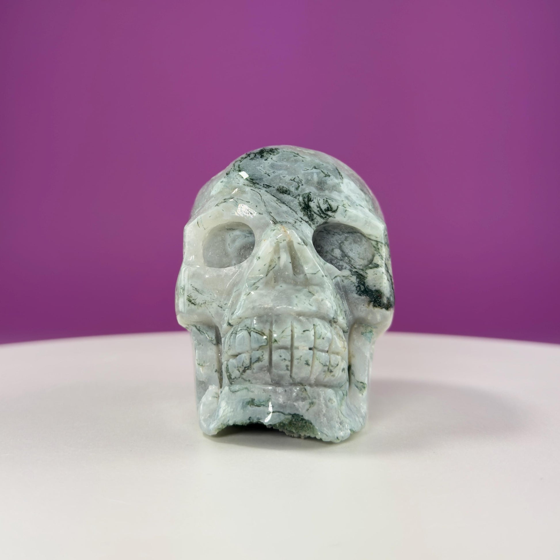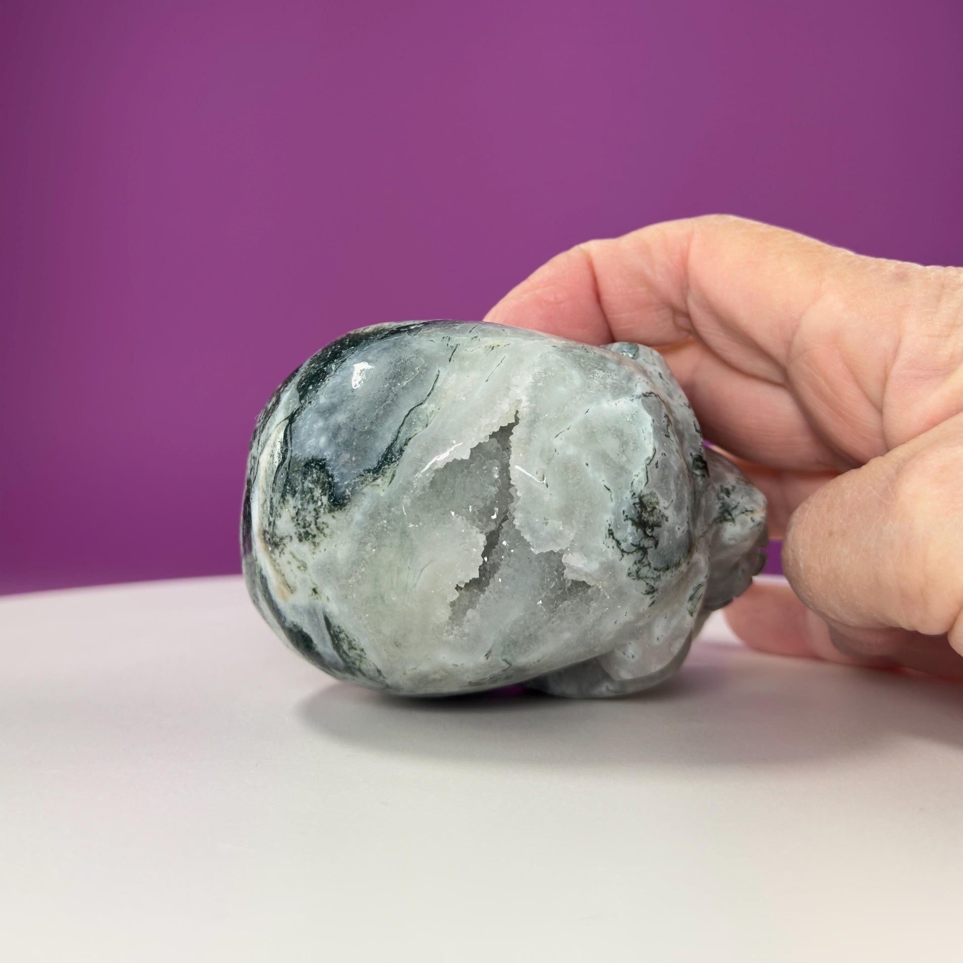 Moss Agate Skull Carving, Druzy Pockets