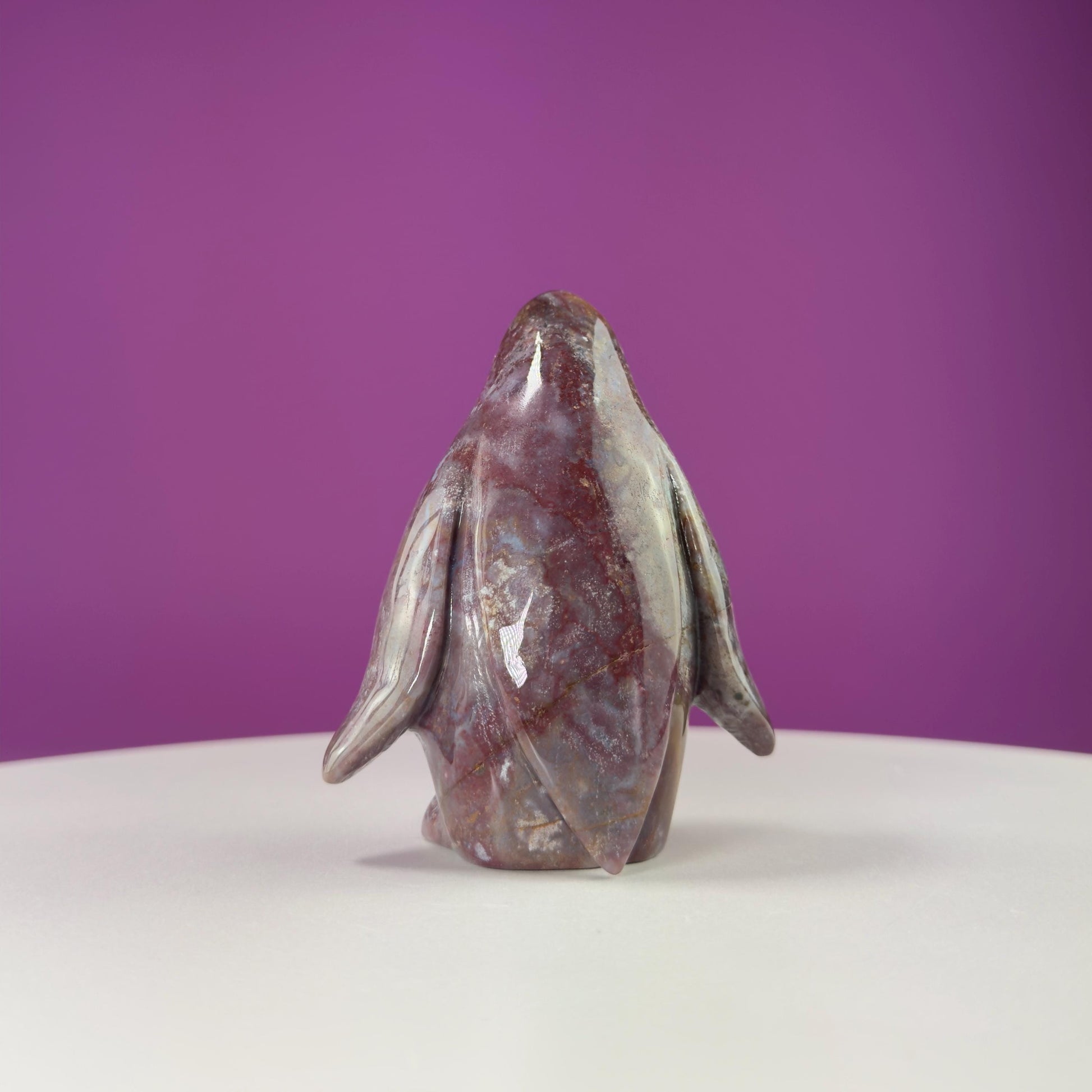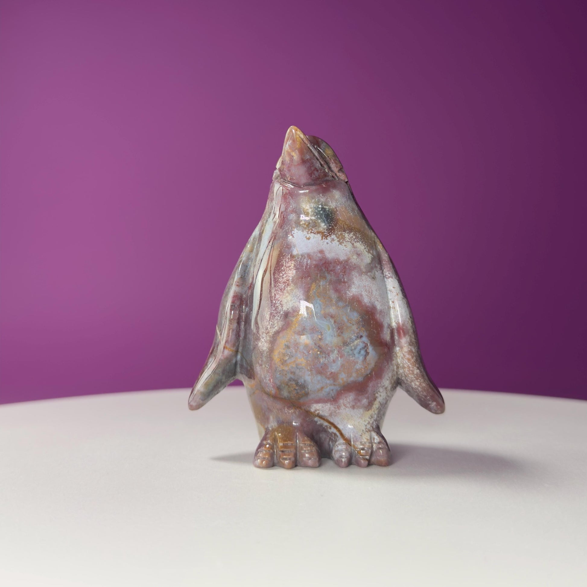 Add a touch of whimsy and tranquility to your space with this adorable Light Ocean Jasper Penguin Carving! This penguin is carefully hand-carved, showcasing the unique patterns and soft, soothing colors of Ocean Jasper. With its gentle swirls of purple, white, and cream, this piece captures the joyful spirit of the penguin and the calming energy of the sea.