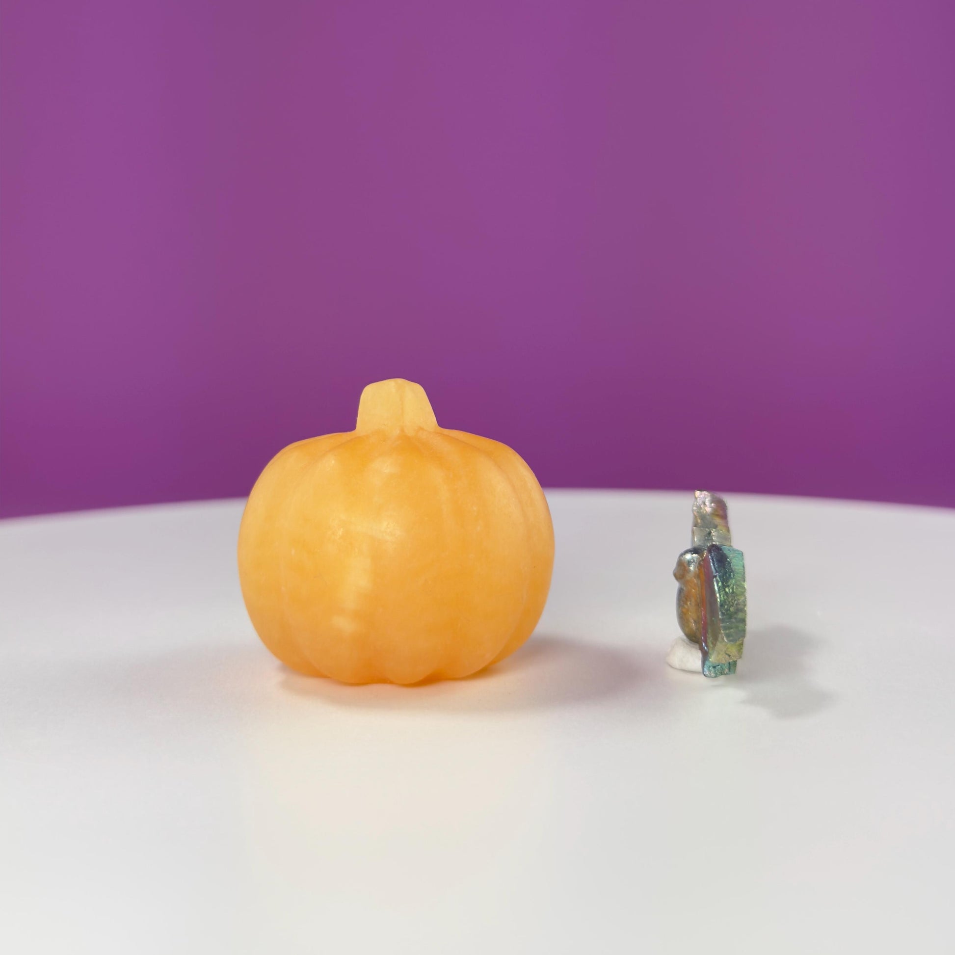 This listing is for one (1) Orange Calcite Pumpkin and Aura Bismuth Bat carvings. The one in the photograph is the one you receive. ALSO-SMALL CARVINGS ARE NOT FOR SMALL CHILDREN AND PETS. NOTE-THE BAT DOES NOT STAND ON ITS OWN. I WILL INCLUDE A DAB OF MINERAL PUTTY AS NOTED IN THE PHOTO.