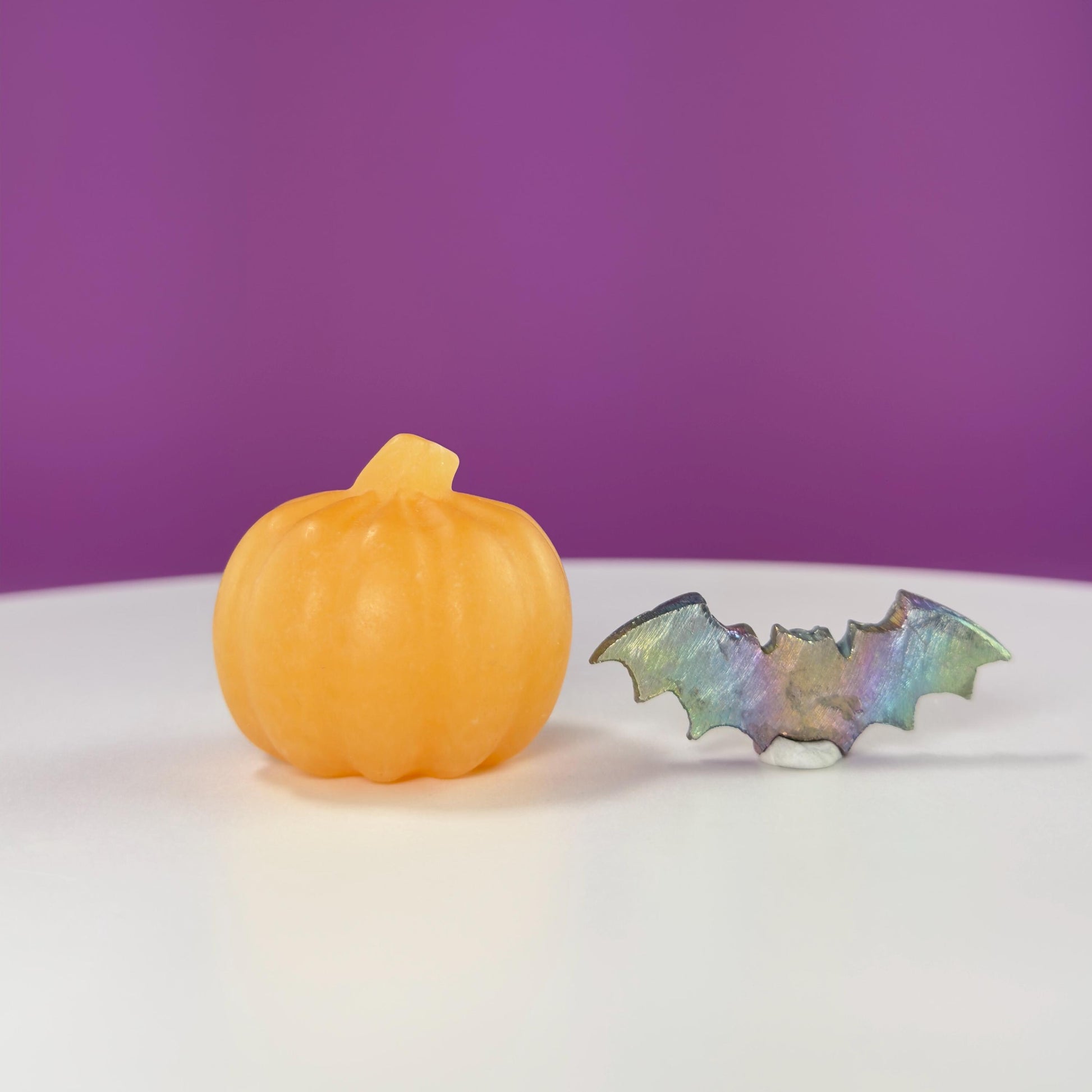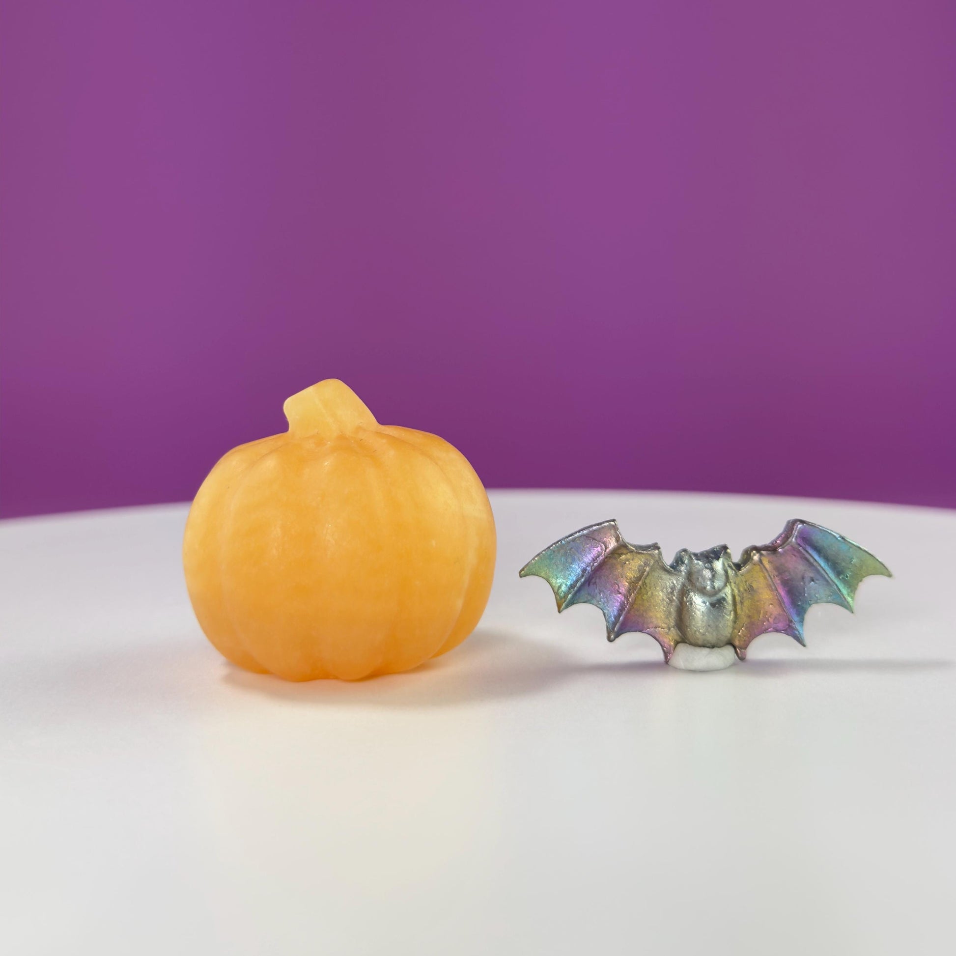 Orange Calcite Pumpkin and Aura Bismuth Bat Carvings