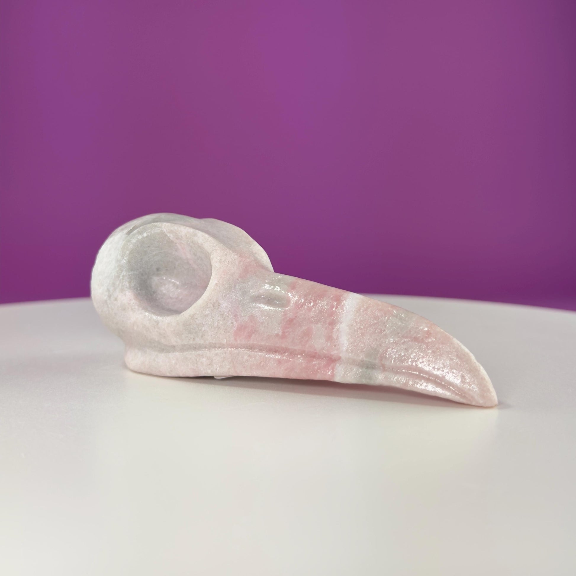 Transform your sacred space with this stunning Pink Opal Raven Skull Carving, a masterpiece that seamlessly blends the mystical power of the raven with pink opal‘s gentle, heart-healing energy! This exquisite carving showcases the raven‘s wisdom and transformation symbolism while radiating pink opal‘s soothing vibrations of emotional healing and inner peace. The soft, milky pastel hues of this beautiful stone create a captivating contrast against the detailed skull carving, making it a striking focal point for meditation altars, crystal collections, or any space that calls for spiritual protection and guidance. Each intricate detail has been carefully crafted to honor both the raven‘s role as a messenger between worlds and pink opal‘s reputation for opening the heart chakra to love and compassion. Whether you‘re seeking to deepen your spiritual practice, add a powerful statement piece to your home, or connect with the raven‘s transformative energy, this one-of-a-kind carving will serve as a constant reminder of your journey toward wisdom and emotional balance!