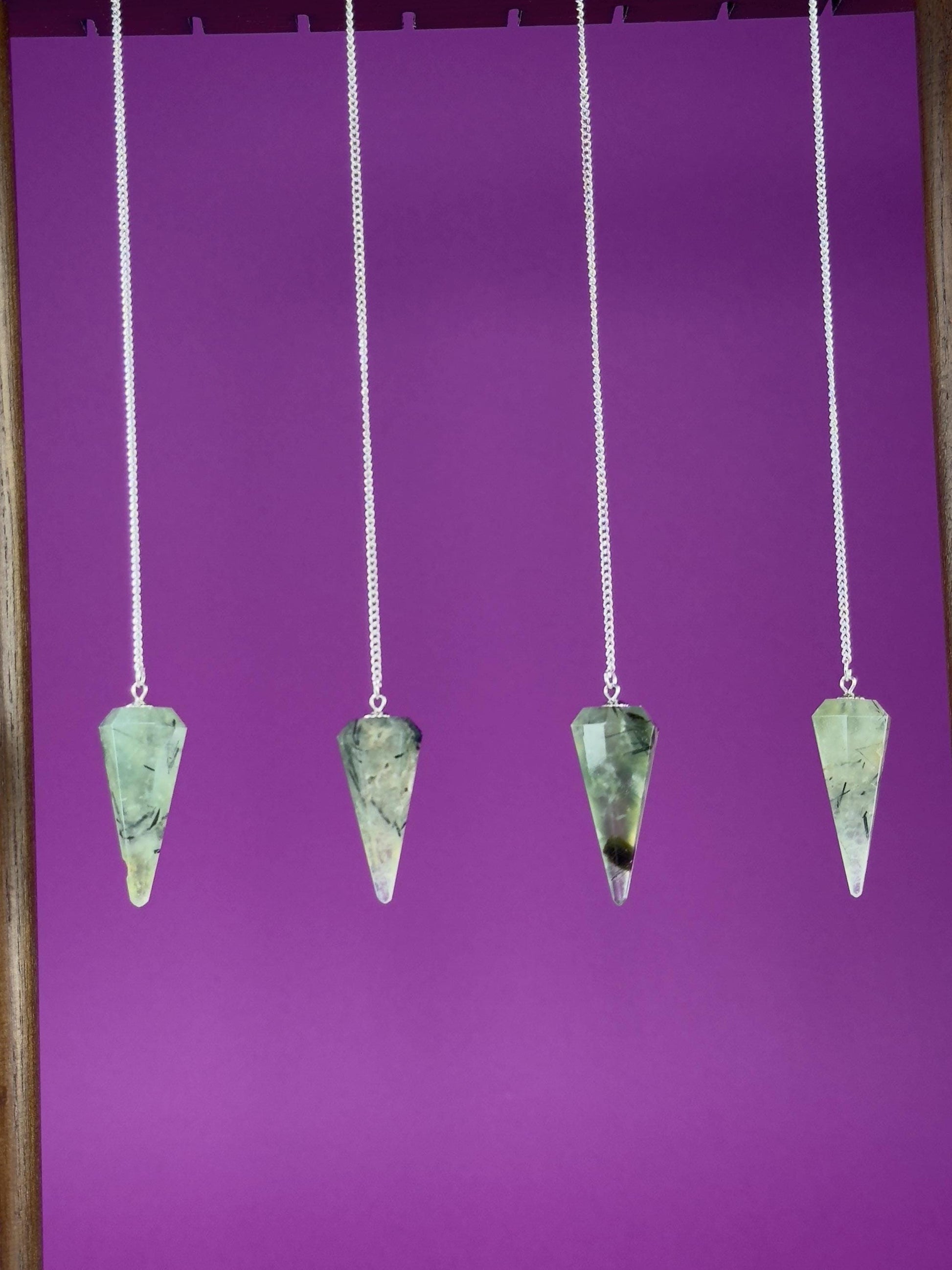 This listing is for one (1) Prehnite Pendulum. It will be intuitively selected