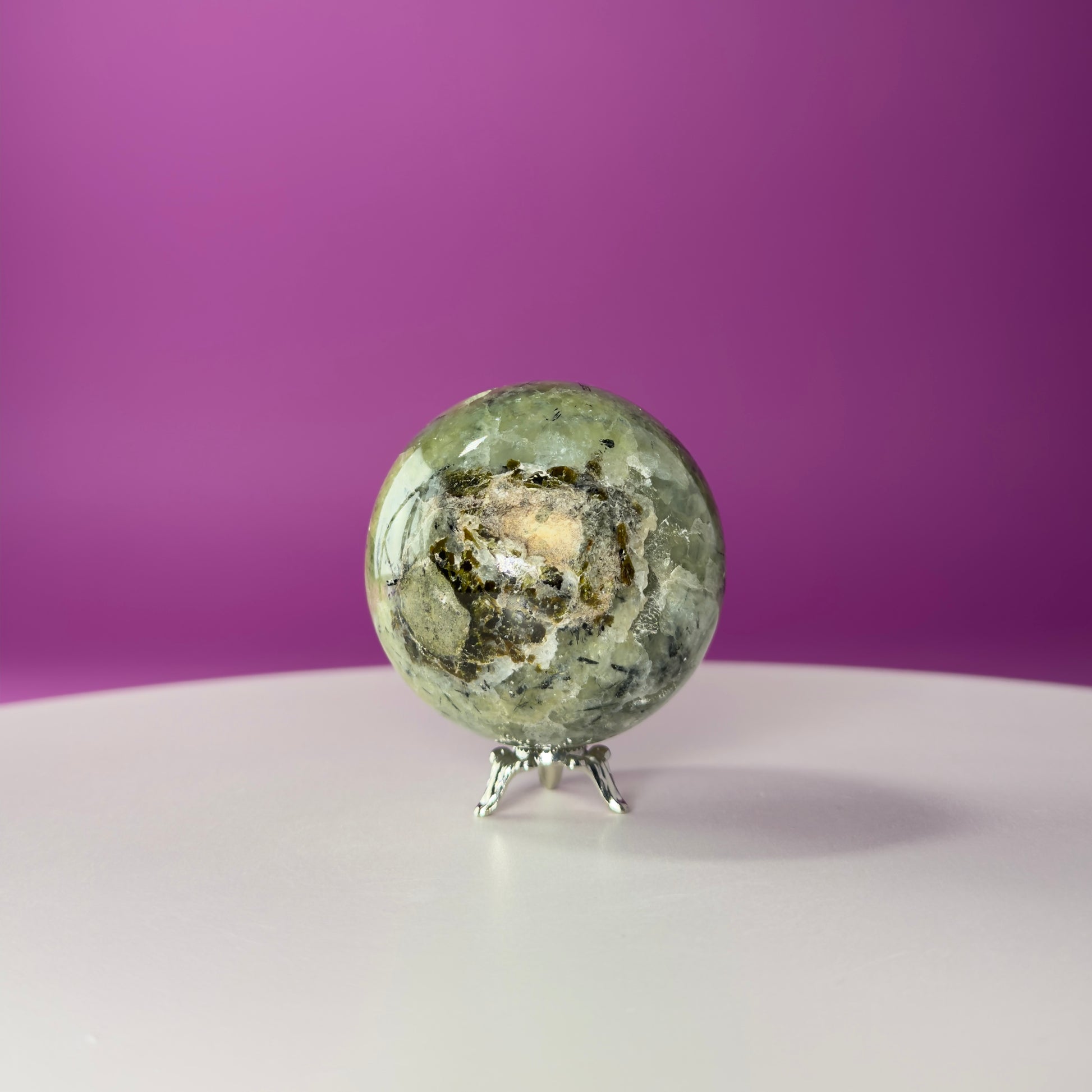 This beautiful Prehnite sphere features soft, translucent green tones accented with natural mineral inclusions, creating a calming and earthy visual presence. Polished into a smooth sphere and paired with a sleek silver metal display stand, this piece makes an elegant statement for crystal displays, meditation spaces, desks, or altars.