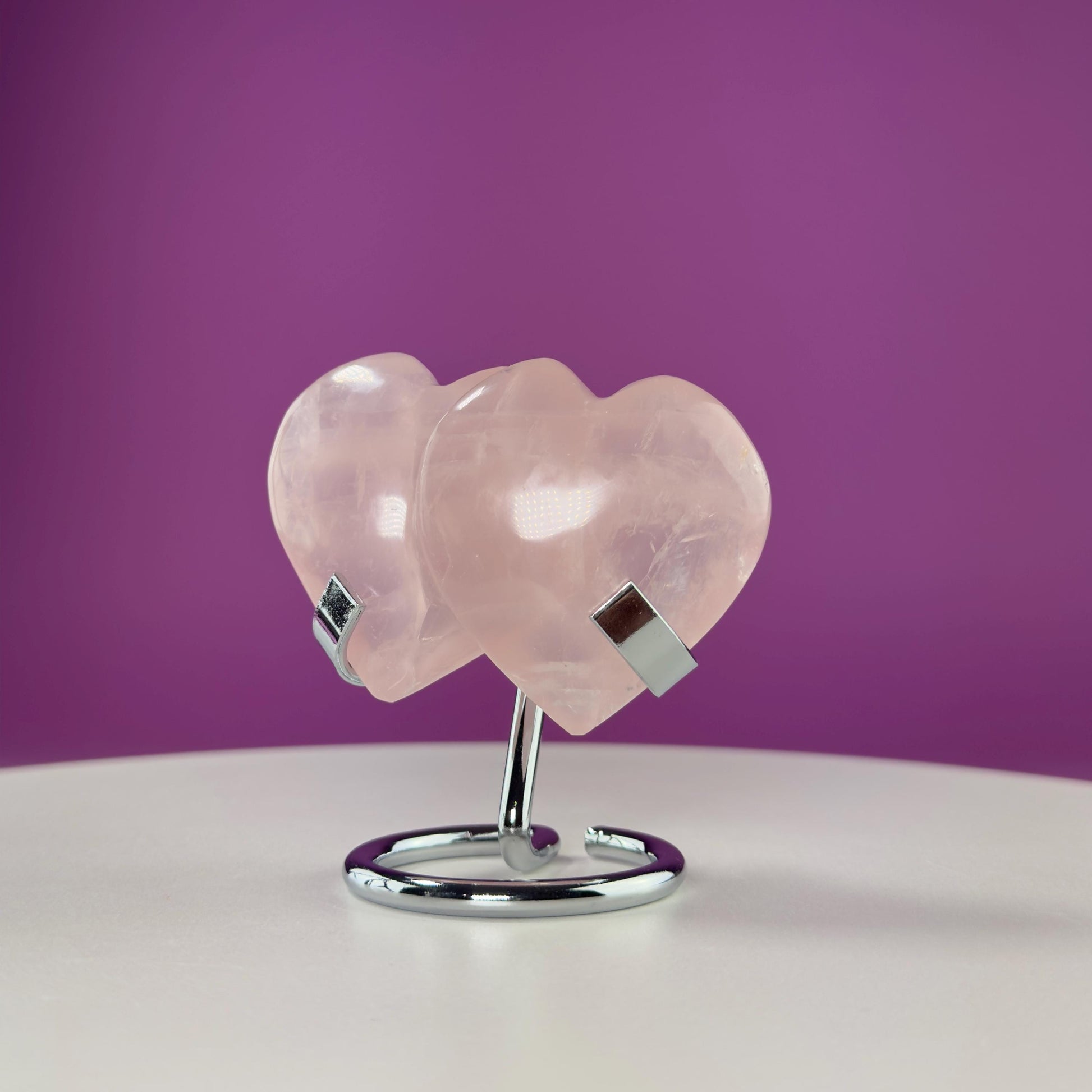 This listing is for one (1) polished Rose Quartz Double Heart and silver metal stand. The one in the photograph is the one you receive.