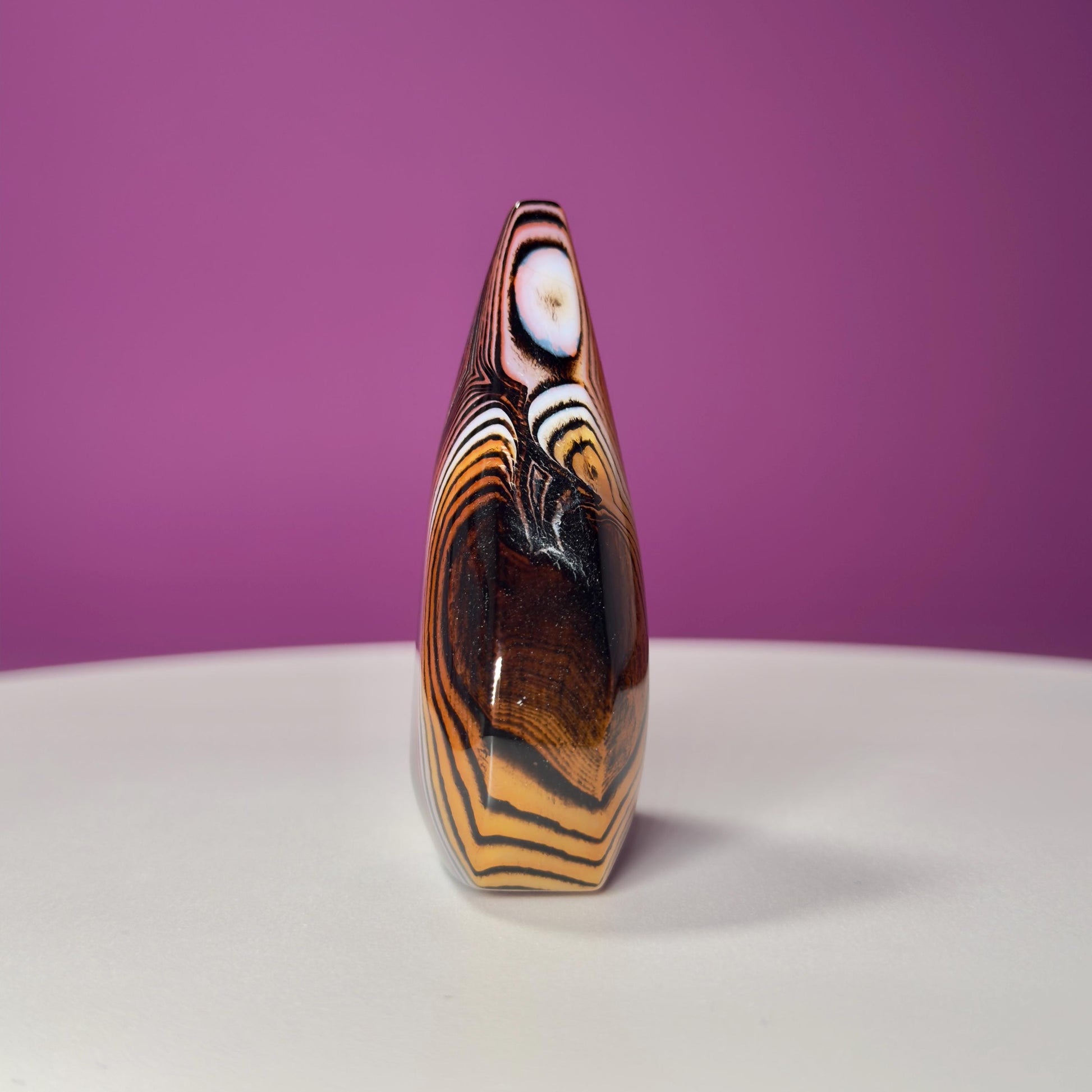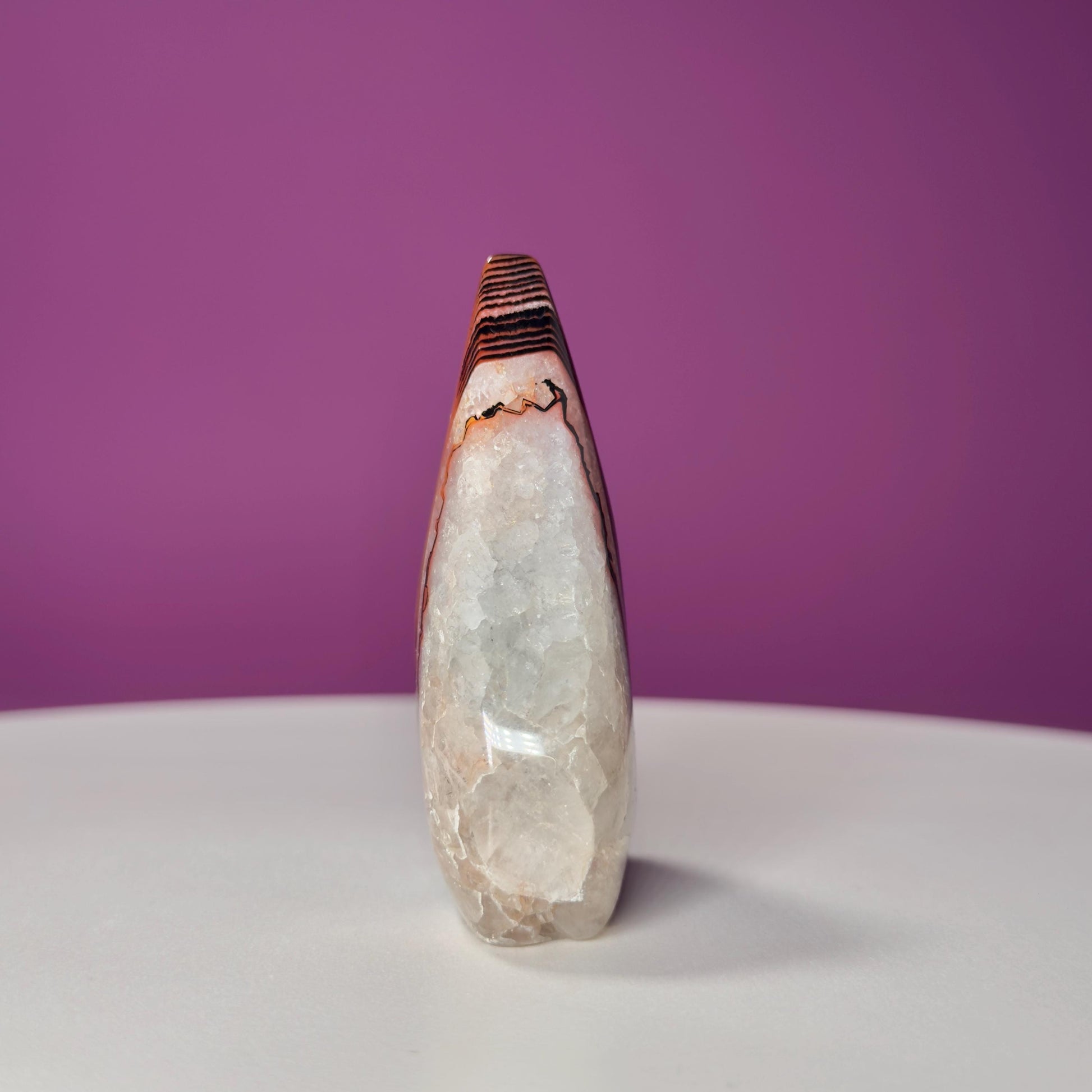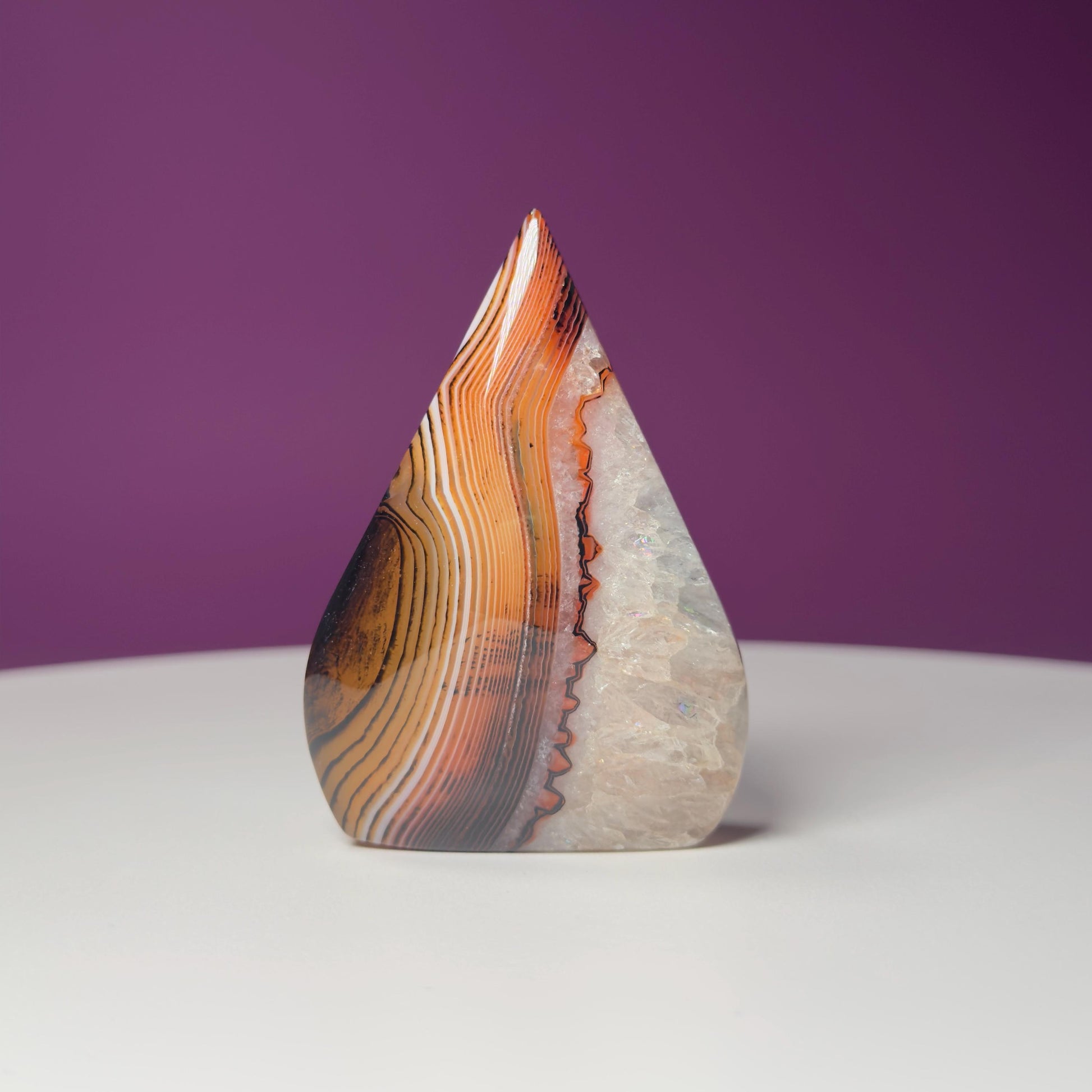 Embrace the stunning beauty and powerful energy of our Sardonyx Tear Drop Carving! This exquisite piece showcases the mesmerizing bands of rich black, cool blue, and whites that make sardonyx such a beloved gemstone. Expertly carved into an elegant teardrop shape, this crystal combines ancient craftsmanship with timeless appeal. Sardonyx has been treasured for centuries as a stone of strength and protection, believed to enhance willpower, boost confidence, and promote emotional stability during challenging times. Whether you‘re drawn to its striking visual appeal for display purposes or seeking its grounding metaphysical properties for meditation and healing work, this tear drop carving serves as both a beautiful decorative piece and a meaningful spiritual tool. The smooth, polished surface feels wonderful in your hands during contemplative moments or placing on your desk as a daily reminder of your inner strength. Add this captivating sardonyx carving to your crystal collection today and experience the harmonious blend of beauty and beneficial energy it brings to your space!