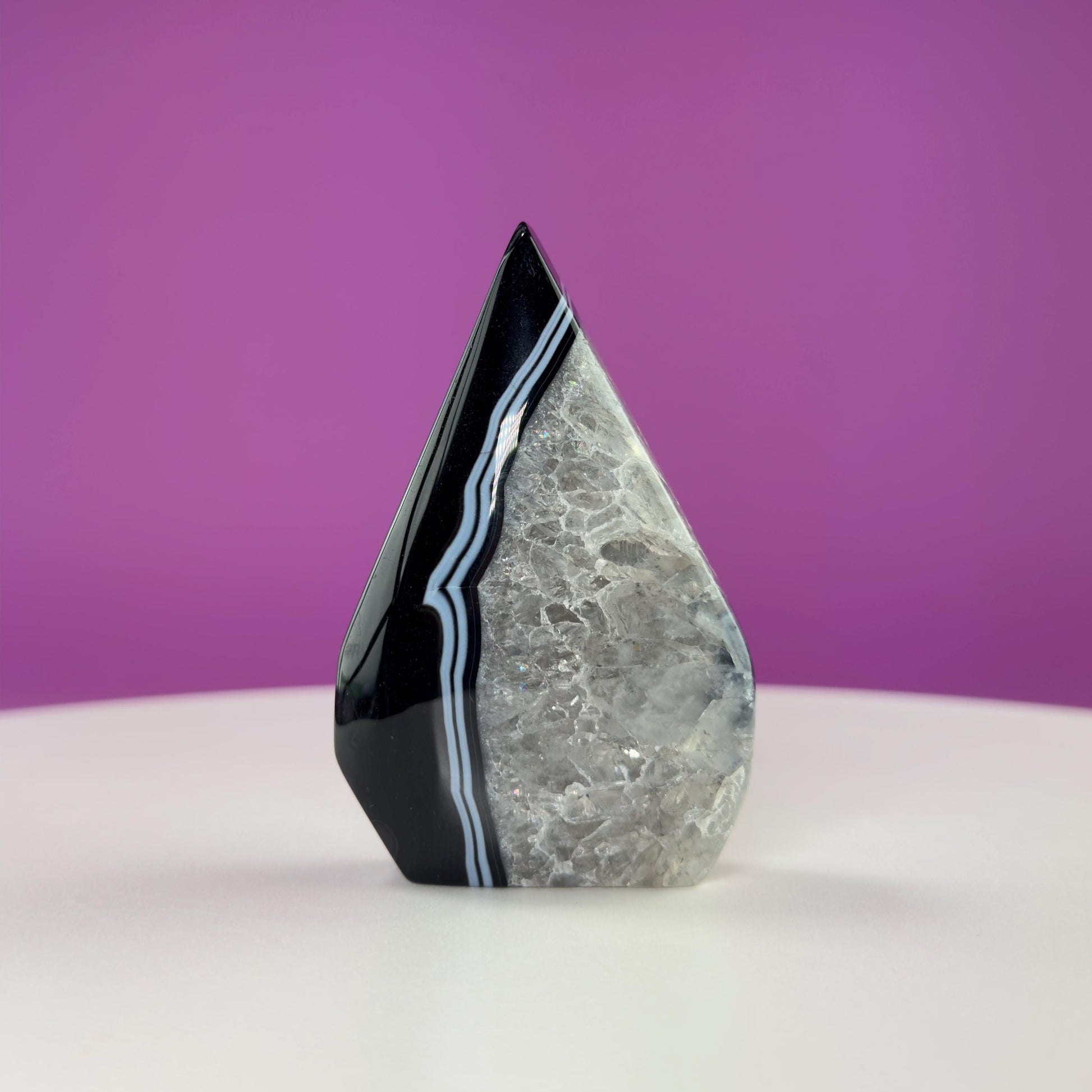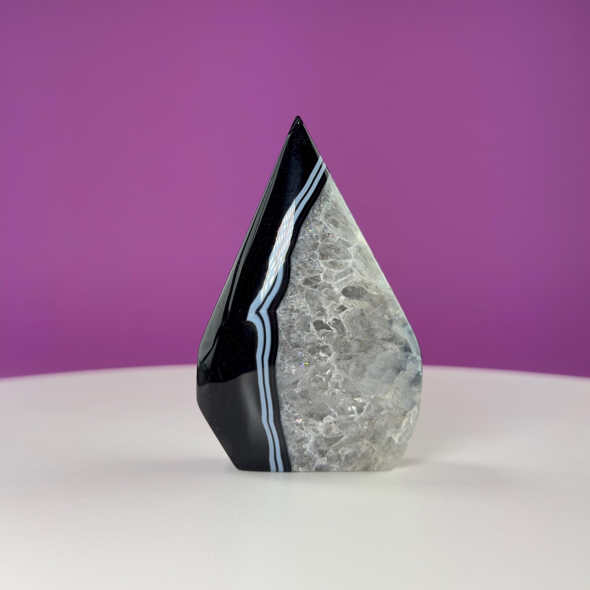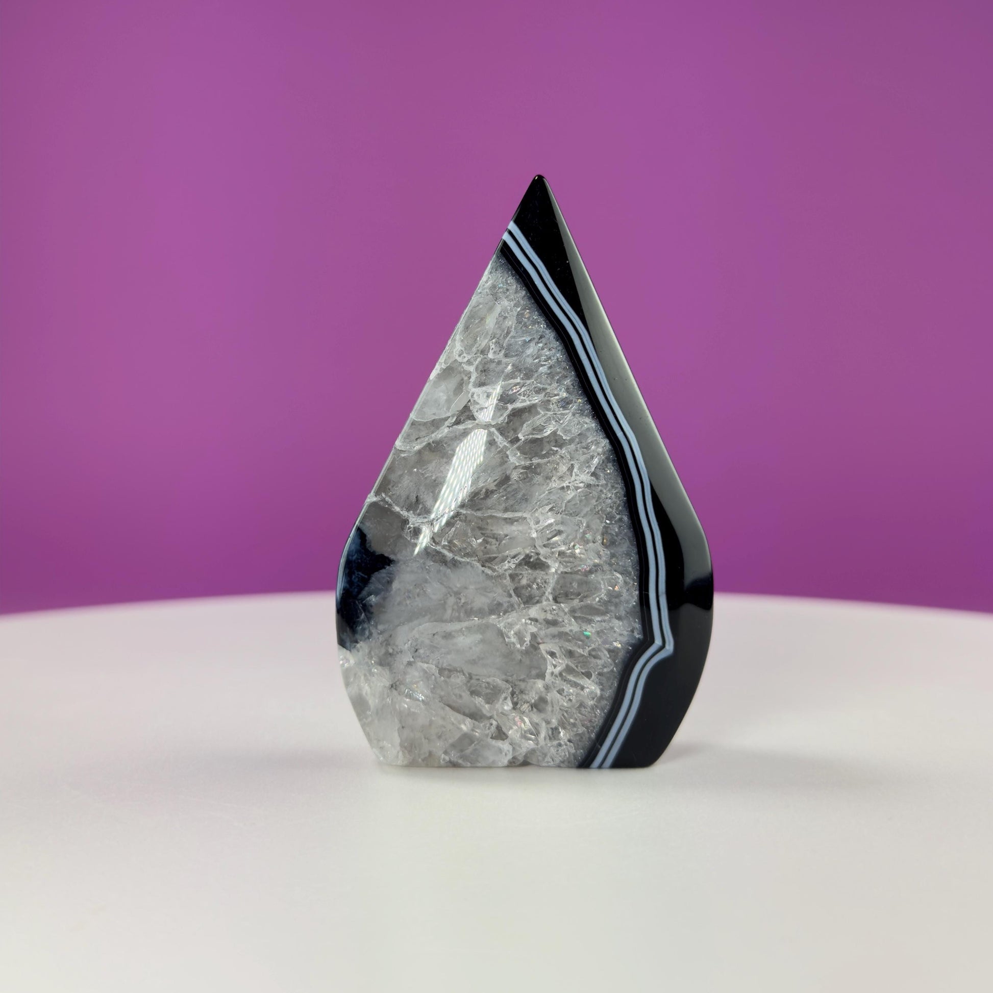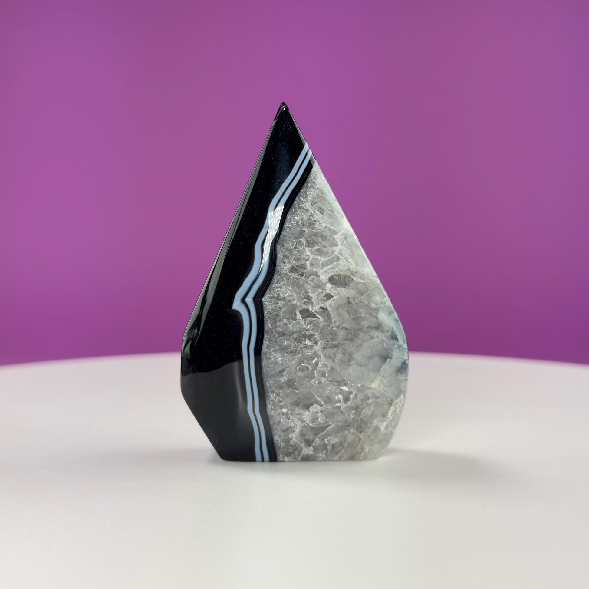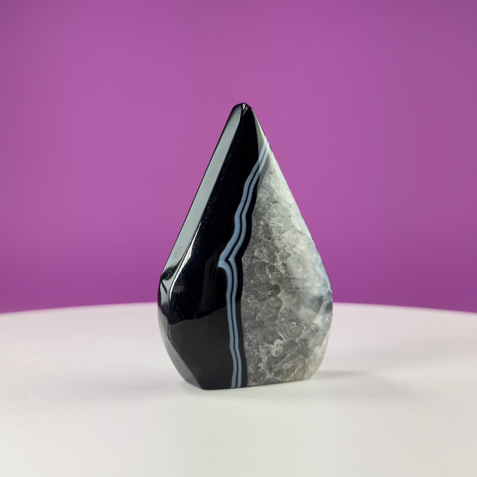 Embrace the stunning beauty and powerful energy of our Sardonyx Tear Drop Carving! This exquisite piece showcases the mesmerizing bands of rich black, cool blue, and whites that make sardonyx such a beloved gemstone. Expertly carved into an elegant teardrop shape, this crystal combines ancient craftsmanship with timeless appeal. Sardonyx has been treasured for centuries as a stone of strength and protection, believed to enhance willpower, boost confidence, and promote emotional stability during challenging times. Whether you‘re drawn to its striking visual appeal for display purposes or seeking its grounding metaphysical properties for meditation and healing work, this tear drop carving serves as both a beautiful decorative piece and a meaningful spiritual tool. The smooth, polished surface feels wonderful in your hands during contemplative moments or placing on your desk as a daily reminder of your inner strength. Add this captivating sardonyx carving to your crystal collection today and experience the harmonious blend of beauty and beneficial energy it brings to your space!