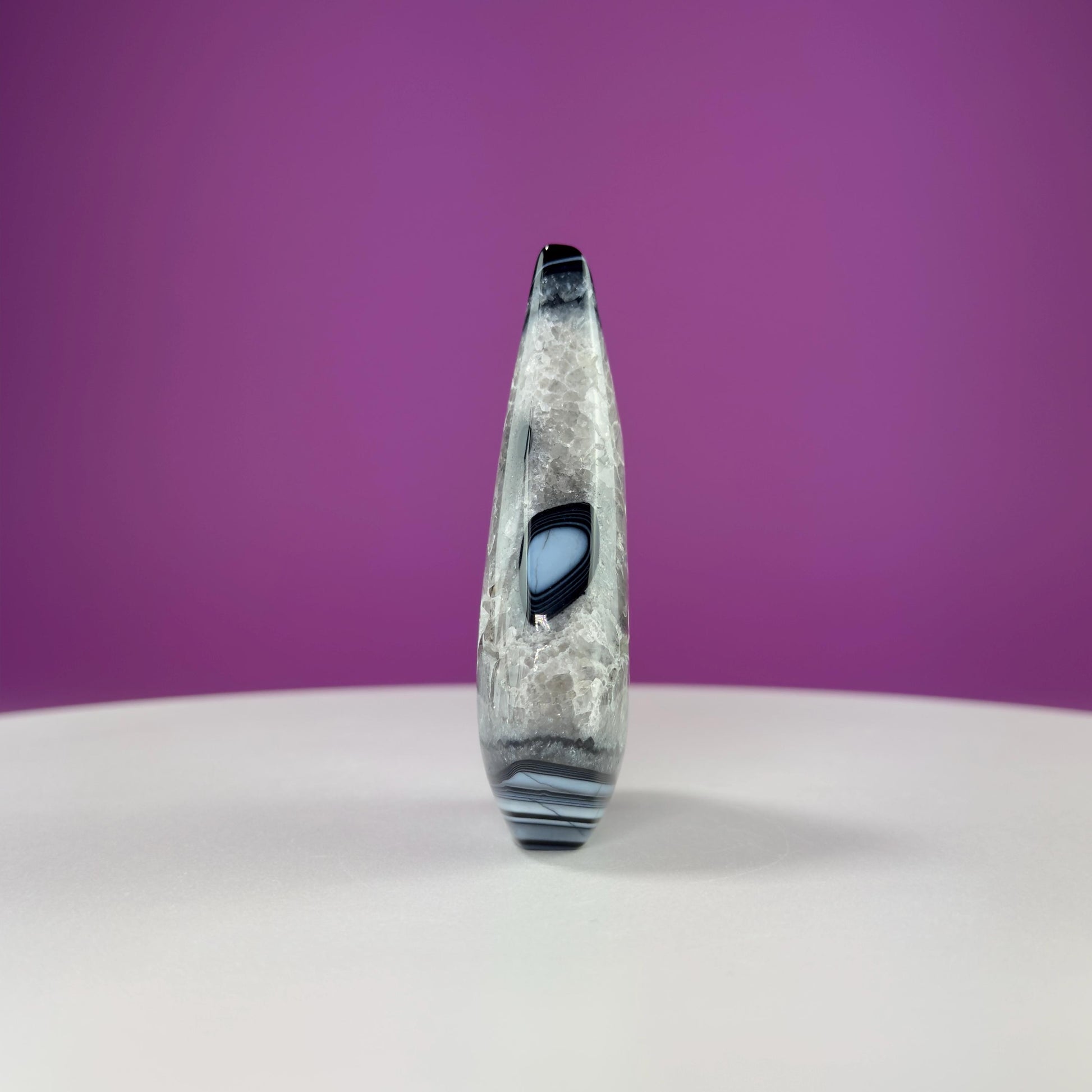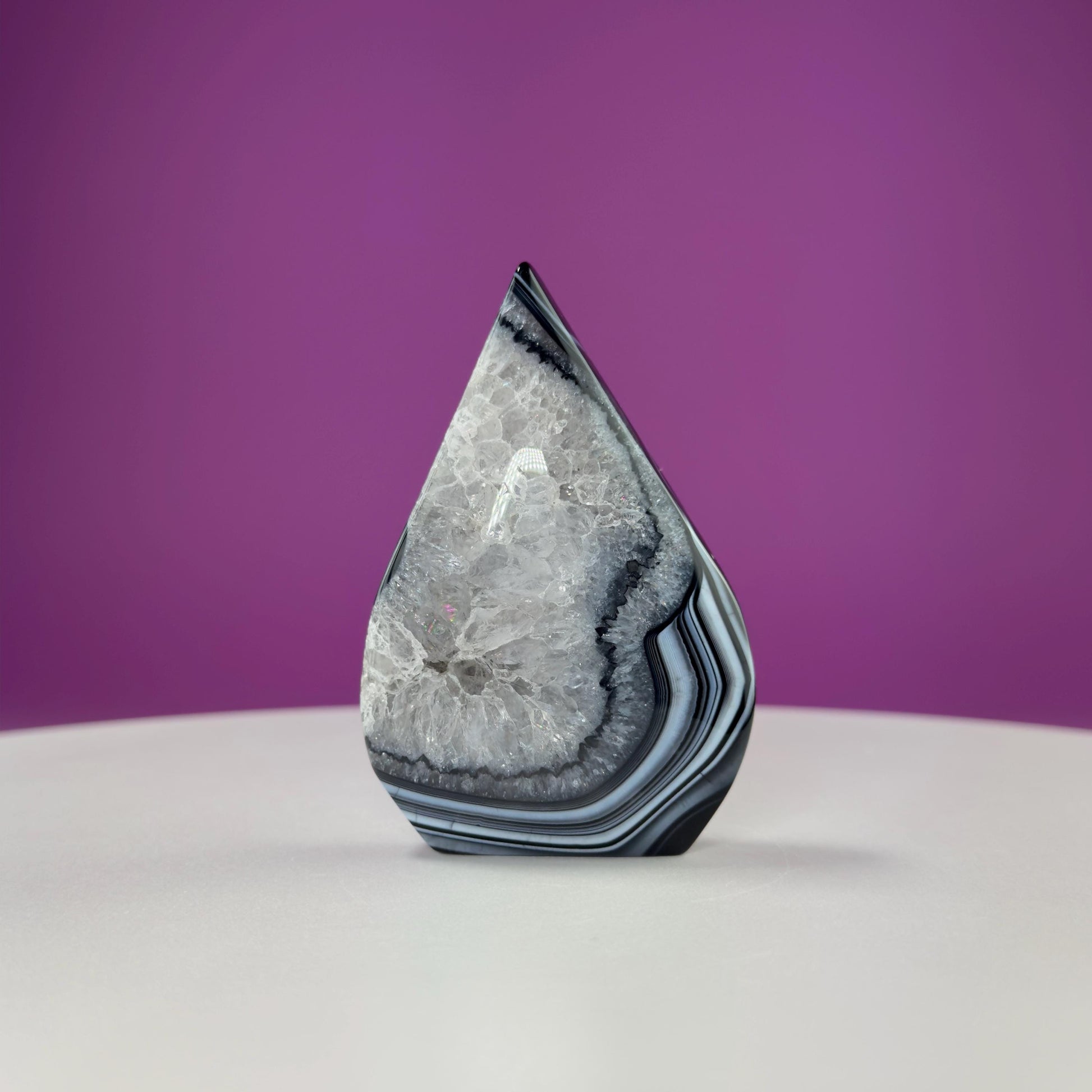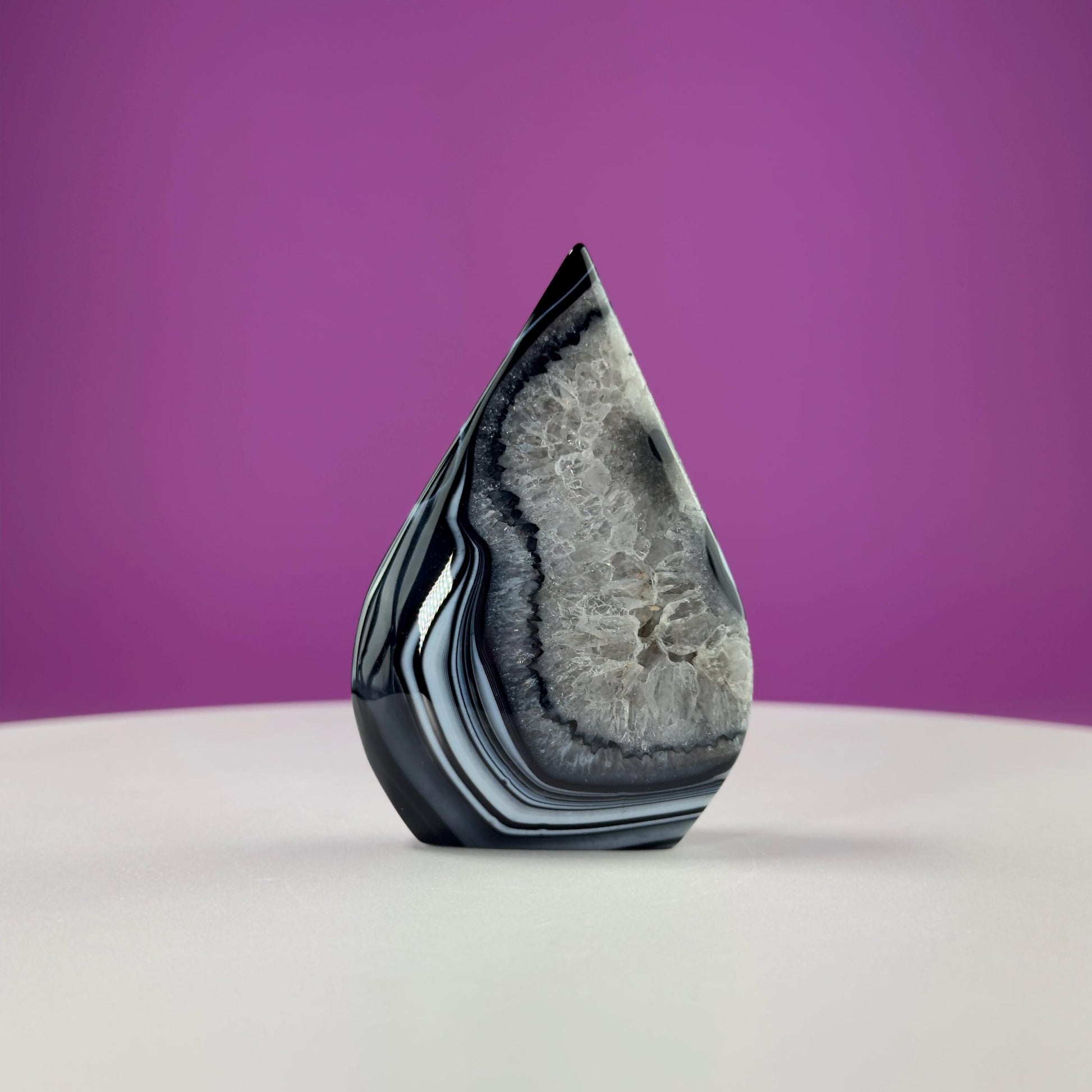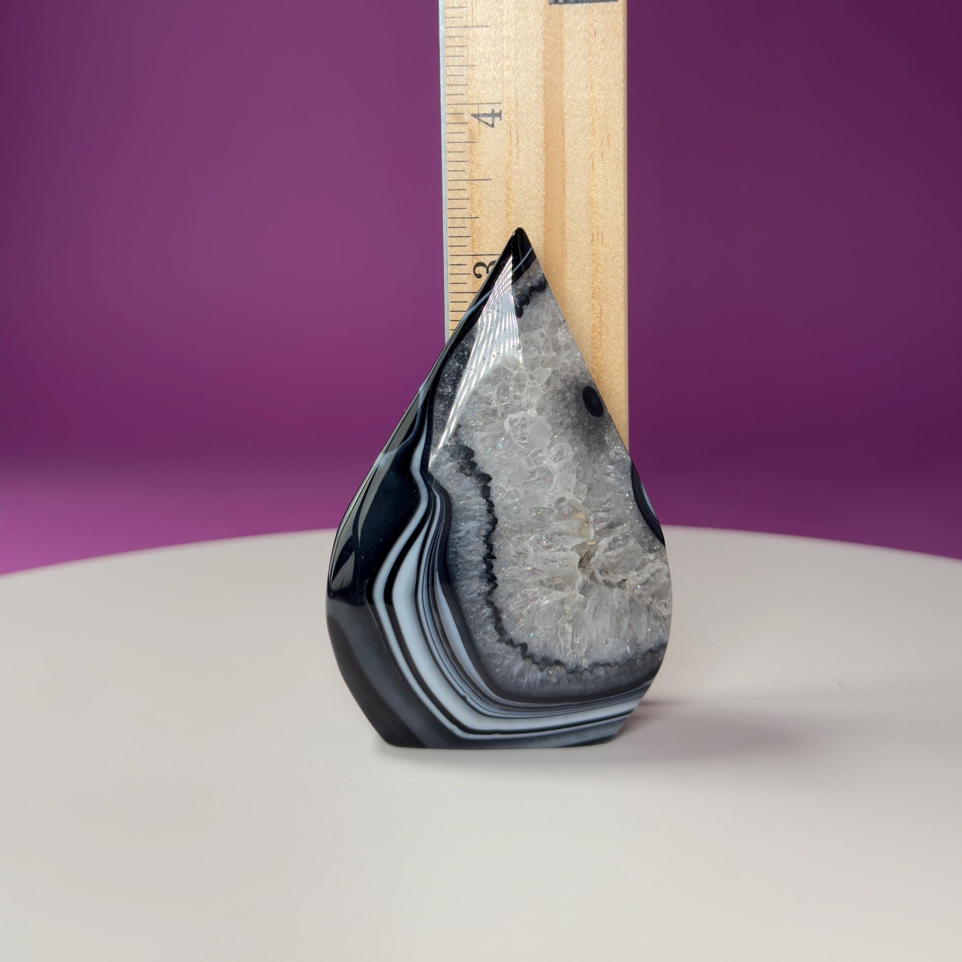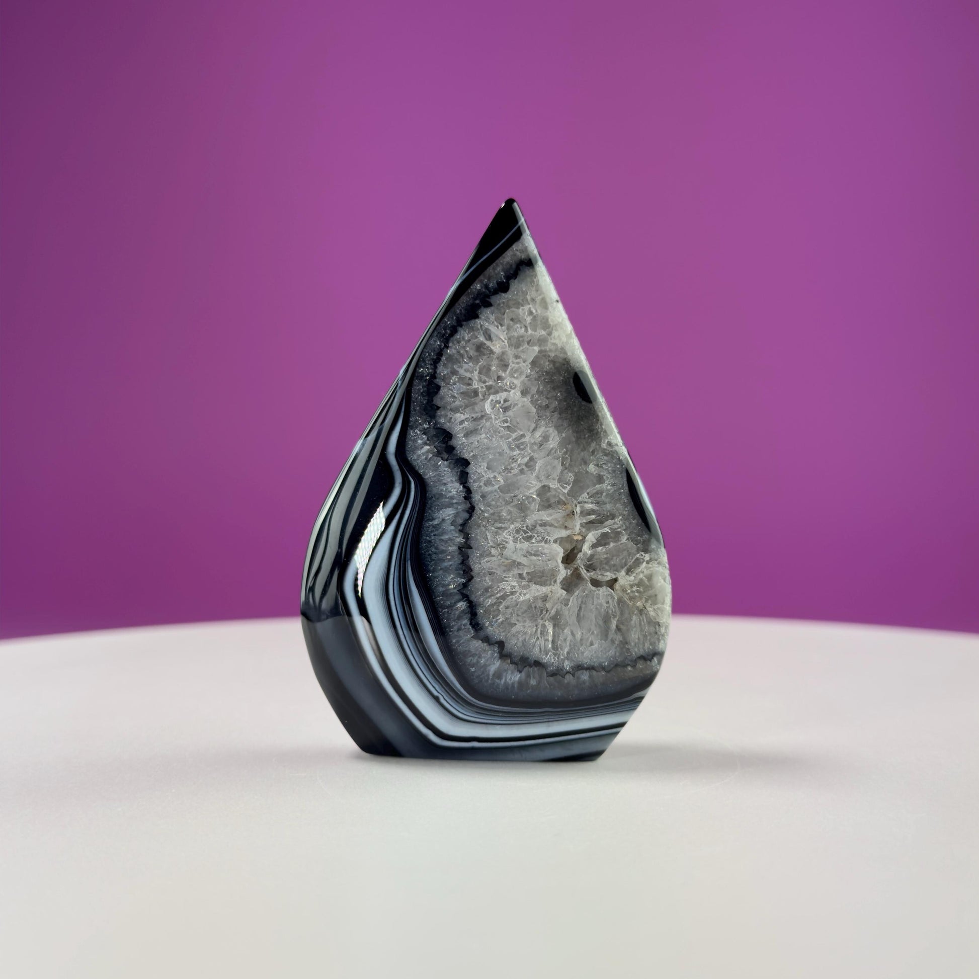 Embrace the stunning beauty and powerful energy of our Sardonyx Tear Drop Carving! This exquisite piece showcases the mesmerizing bands of rich black, cool blue, and whites that make sardonyx such a beloved gemstone. Expertly carved into an elegant teardrop shape, this crystal combines ancient craftsmanship with timeless appeal. Sardonyx has been treasured for centuries as a stone of strength and protection, believed to enhance willpower, boost confidence, and promote emotional stability during challenging times. Whether you‘re drawn to its striking visual appeal for display purposes or seeking its grounding metaphysical properties for meditation and healing work, this tear drop carving serves as both a beautiful decorative piece and a meaningful spiritual tool. The smooth, polished surface feels wonderful in your hands during contemplative moments or placing on your desk as a daily reminder of your inner strength. Add this captivating sardonyx carving to your crystal collection today and experience the harmonious blend of beauty and beneficial energy it brings to your space!