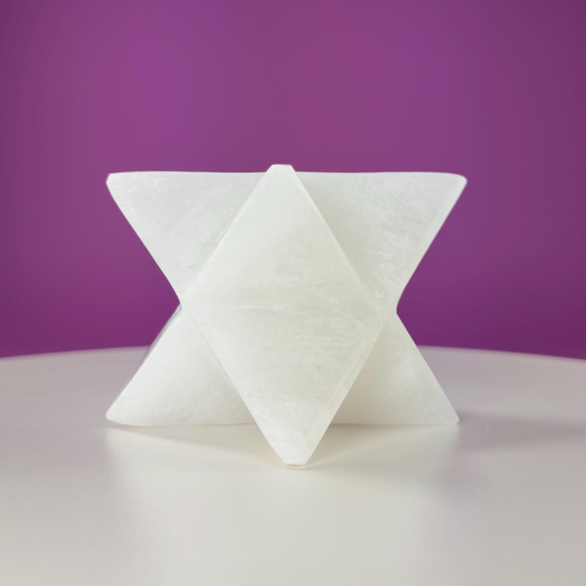 Experience the profound energy and sacred geometry of our stunning Selenite Merkaba Carving! This exquisite piece combines the purifying power of selenite with the ancient mystical symbol of the merkaba, creating a truly transformative addition to your crystal collection. Hand-carved from high-quality selenite, this luminous white crystal radiates pure, cleansing energy that effortlessly clears negative vibrations from any space. The merkaba‘s sacred geometric form—featuring two interlocking triangular pyramids—represents the divine light vehicle used for spiritual ascension and protection. Place this powerful carving on your altar, meditation space, or anywhere you seek to elevate the energy, and watch as it creates a sanctuary of peace and spiritual connection. The smooth, polished surface catches and reflects light beautifully, while the selenite‘s natural properties continuously charge and cleanse your other crystals nearby. Perfect for energy workers, meditation practitioners, or anyone drawn to sacred geometry, this selenite merkaba serves as both a stunning decorative piece and a potent spiritual tool for transformation and enlightenment!