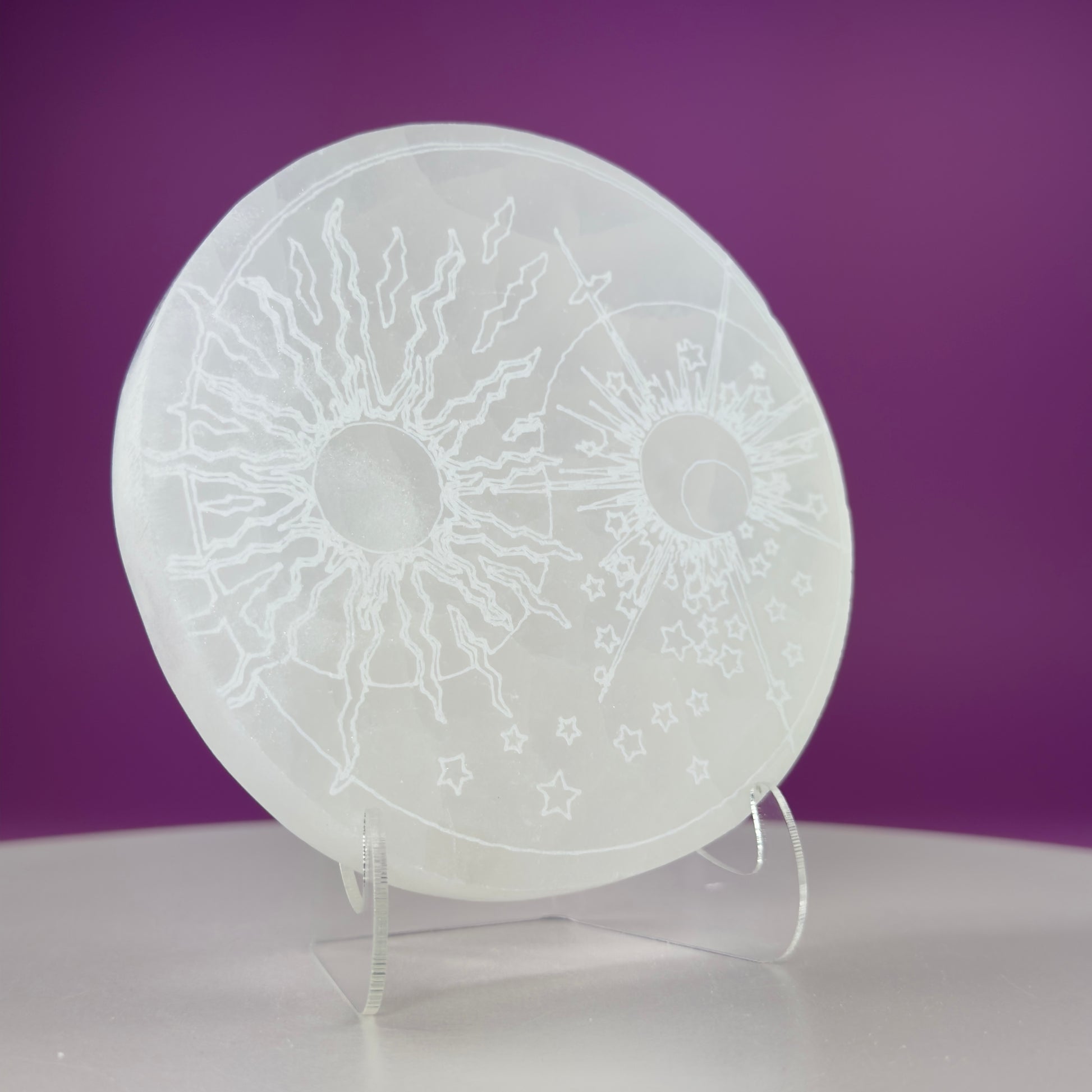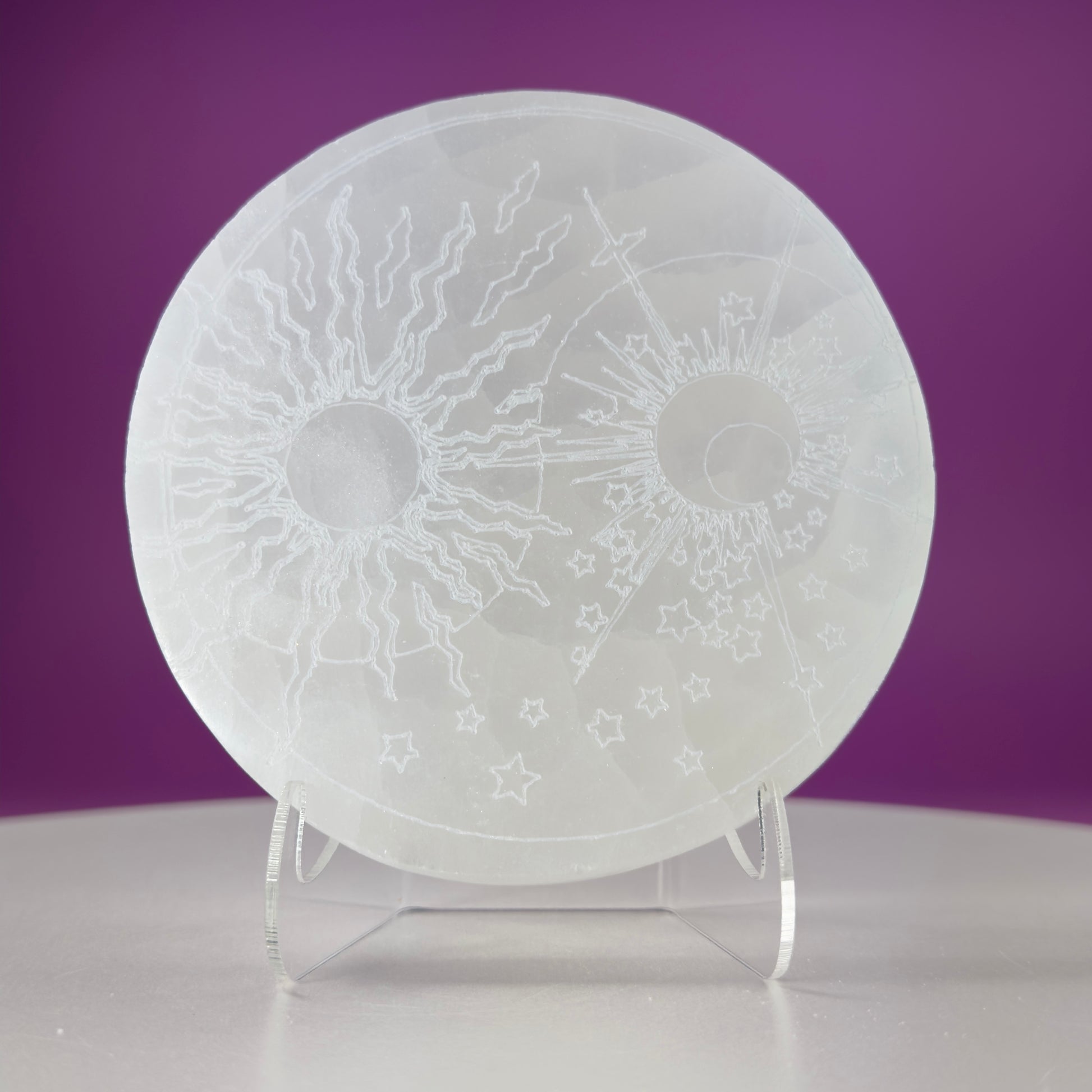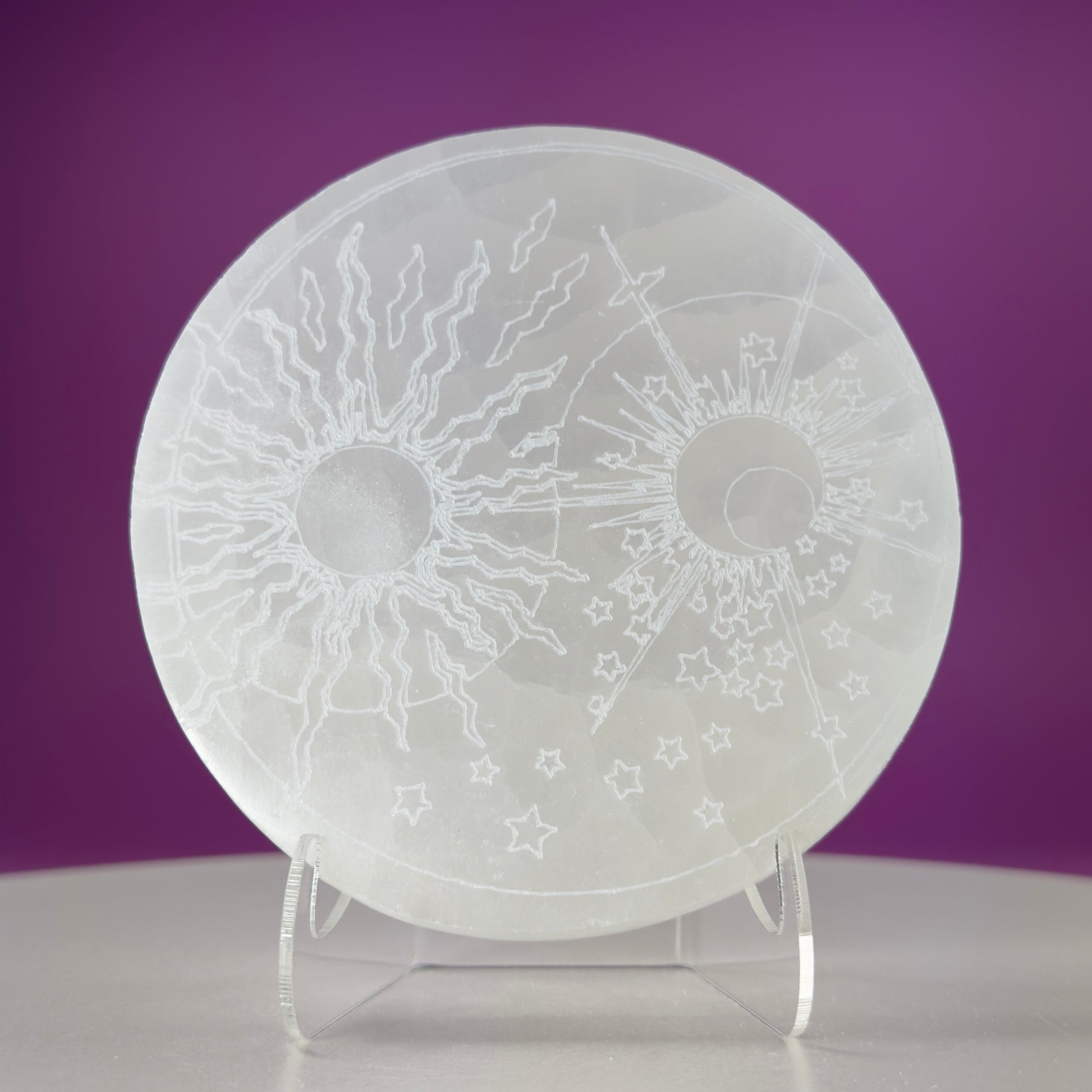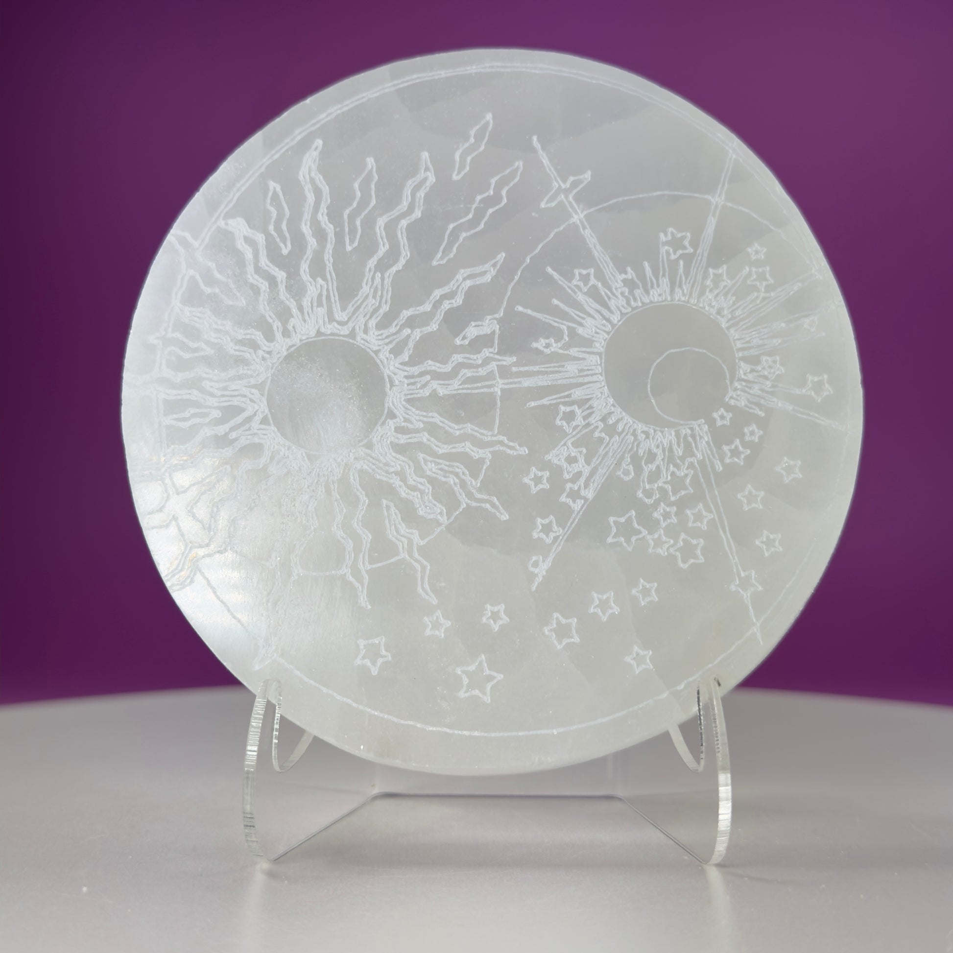 This listing is for one (1) Selenite Sun Moon Charging Plate and Acrylic Stand.