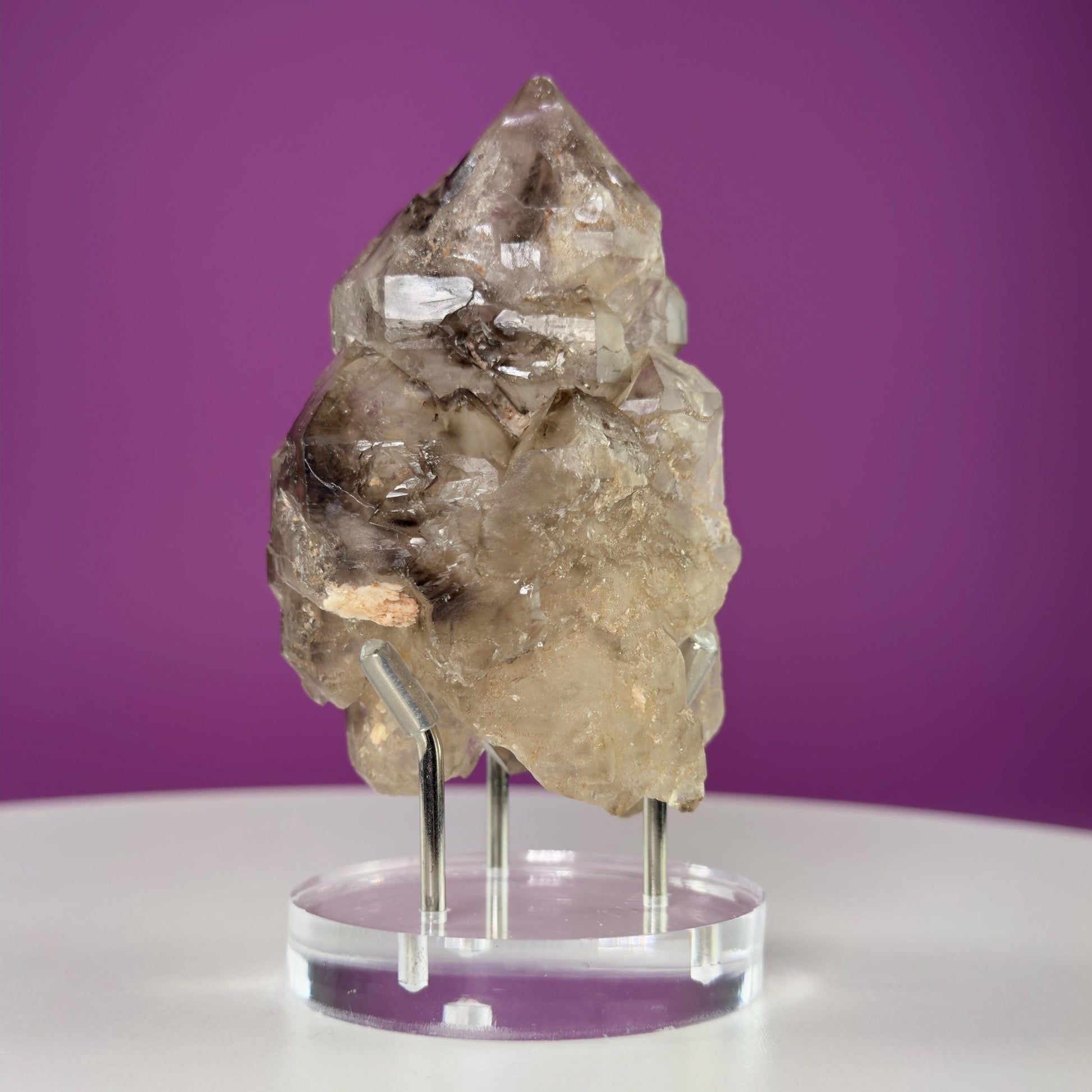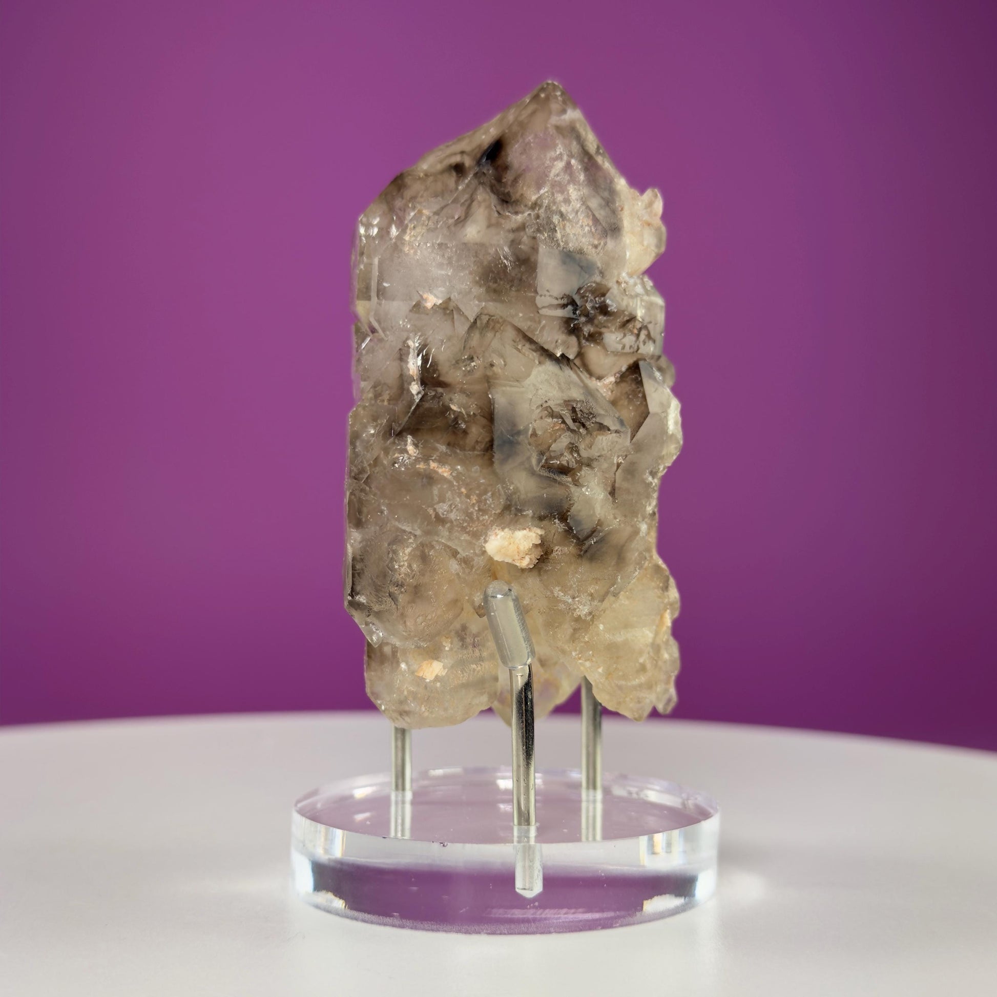 Smoky Quartz Elestial Specimen (Includes Silver Metal/Acrylic Stand)